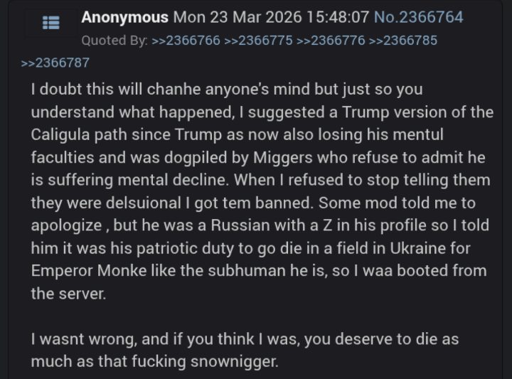 >>2368103>I throw slurs around because anything weaker than that might as well be baby talk on 4chinzI see, naruhodo, so you are an atomwaffen chud.