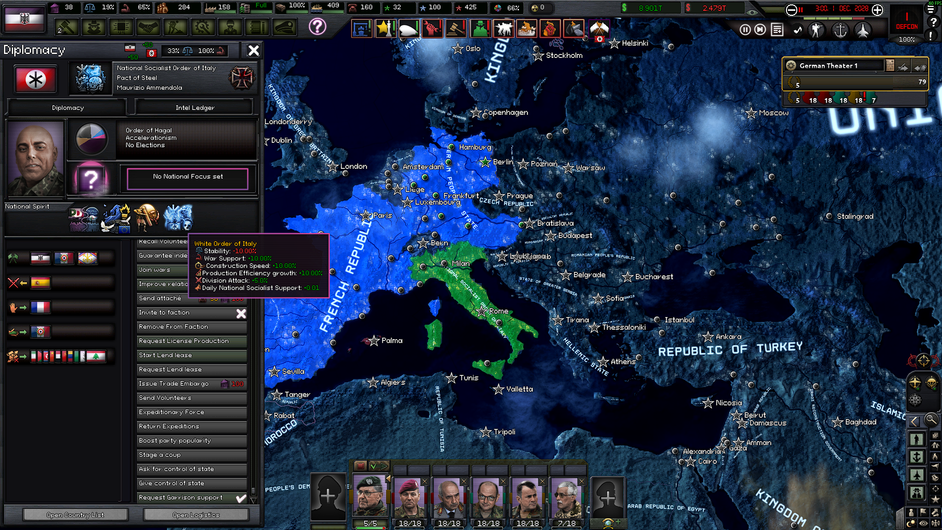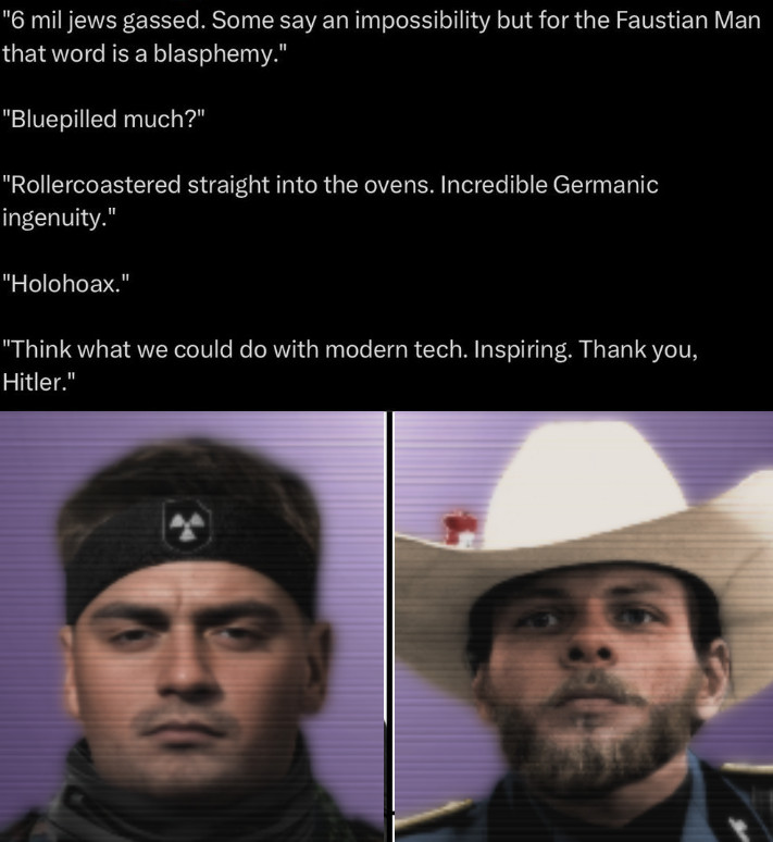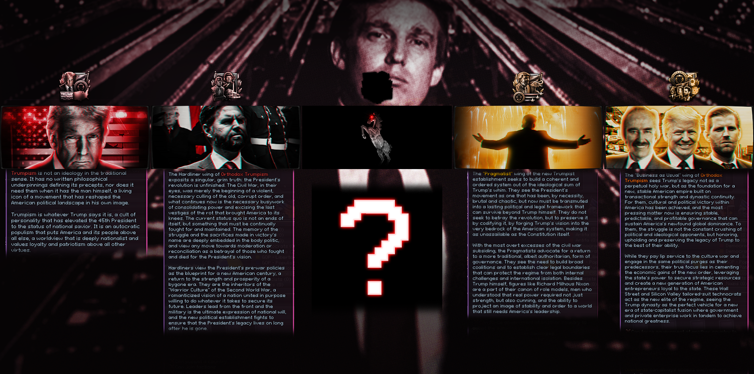 >>2371822>The biggest mechanical problem ATW has right now is you can waste all your PP building Legitimacy only for the other factions to declare war on you.I do think they should change it so if you don't have enough Legitmacy they'll kick you out of the NF and declare war on you like normal, but if you have more than the other members you get a buff during the war and maybe some of their divisions defect to your side as well.>But the Accelerationist and Satanist paths seem canonically impossible to coexist in the National FrontThe enemy of my enemy is my 'friend', it's pure headcanon but I imagine the majority of the AWD members (and especially upper echelon) are executed/imprisoned after the war with maybe only a few exceptions in a Hitlerist NSM America.