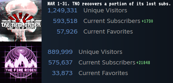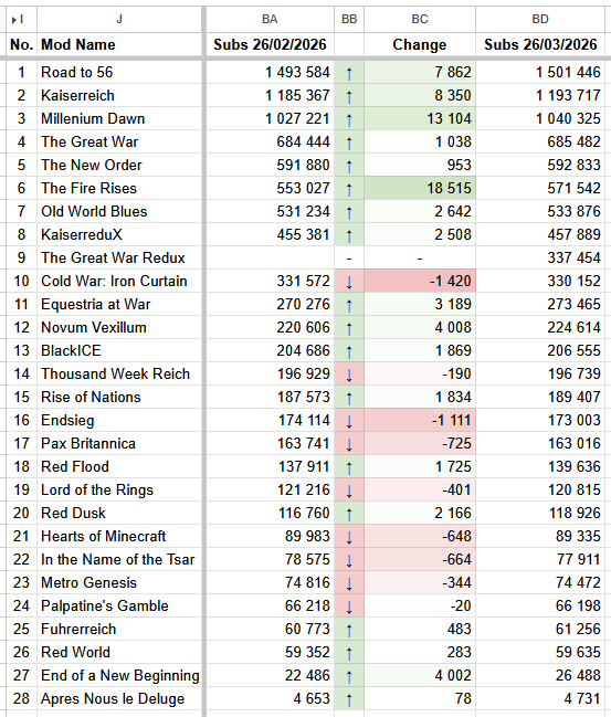 >>2367795FEB26 - MAR2626th of the Month. Here's a spreadsheet update:Noteworthy changes:>BIGGEST GAIN: The Fire Rises with +18 515>BIGGEST LOSS: Cold War Iron Curtain with -1 420>Added The Great War Redux to the list as I honestly didn't even know it was still being developed. >Generally, the bleed of most mods has been stymied. TNO and TGW were both losing subscribers but have managed to gain some this month>Pax Britannica needs to update ASAP if they want to stop losing subscribers. This is the sixth month in a row they are running a lossPretty boring month overall. People are subscribing to mods more often.