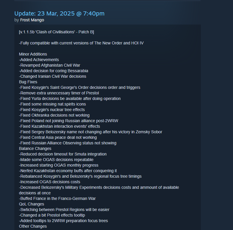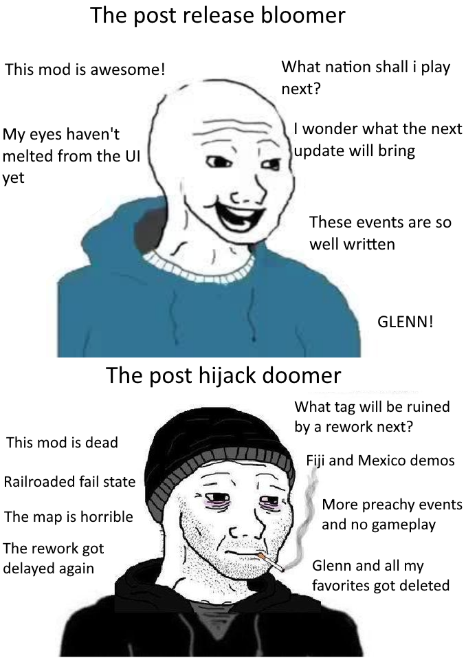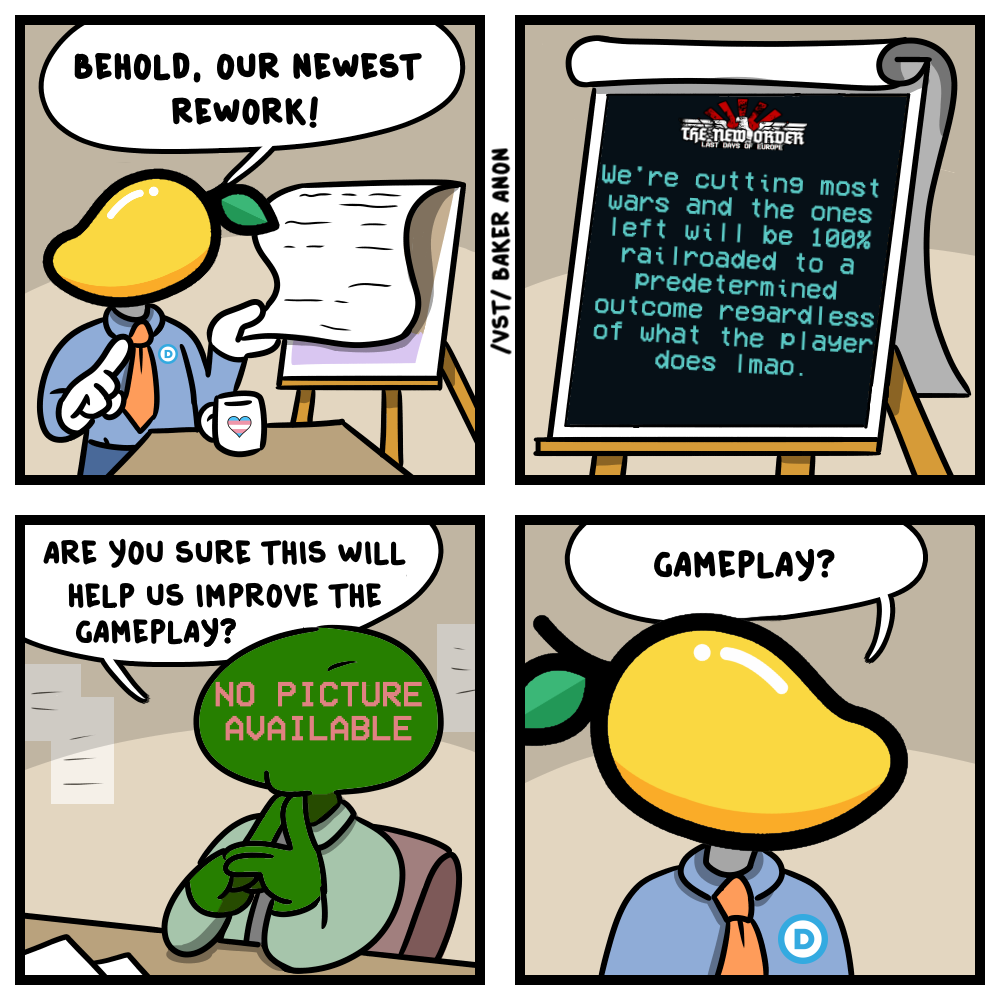 >>2374375>DEAD MOD NEWS>TNO suffers its biggest leak since 2024 with multiple Git branches, flowcharts and documents being released to the public.>Iberia's update has been delayed by two more months, reportedly stalled.>Mango has promised to step down as Fuhrer of TNO once the US rework is complete.>Dev claims that Mango is siphoning resources from other teams to finish the US rework while most of the mod remains unplayable.>US rework internally scheduled for a Q4 2026-Q1 2027 release.>Earlier leak confirm that Germany will pull a Haiti and just nuke Gorky for some reason.>Competency crisis: Devs claim they can't push updates because unfinished Iberia content is still on master, can't operate a Git.>TNO fixes its naval bug and thus becomes barely playable more than a hundred days after the reduxes fixed this issue.>Italy rework revived along with Red Italy after years of inactivity.>Team member/leaker alleges that the old Italy lead was shadowbanned. Unproven, treat it accordingly.>4chan successfully bullies TNO's head janny Kateryna into reworking several of his tags.>TNO jannies once again confirmed to frantically F5 this thread in an effort to ban leakers from Discord.>Leaker anons claim to have multiple more flowcharts and builds.>TFO lost its main coder but eventually regained one meaning that we may receive new island teasers in the future.>Anons discover that the TNO TV Tropes page pre-emtpively write as if their reworks have released leading to many a laugh.>REAL MOD NEWS>PNO, the true successor to TNO, releases a teaser for its post-Plankton warlord era content in "Shifting Tides".>Rises Again starts work on a Dengist Speer update.>Rises Again pledges to reverse Pacifica's decision to remove Vladimir Putin from the timeline, will be a character in their mod.>Requiem releases a warlord intro for Berezniki.