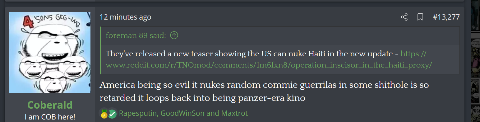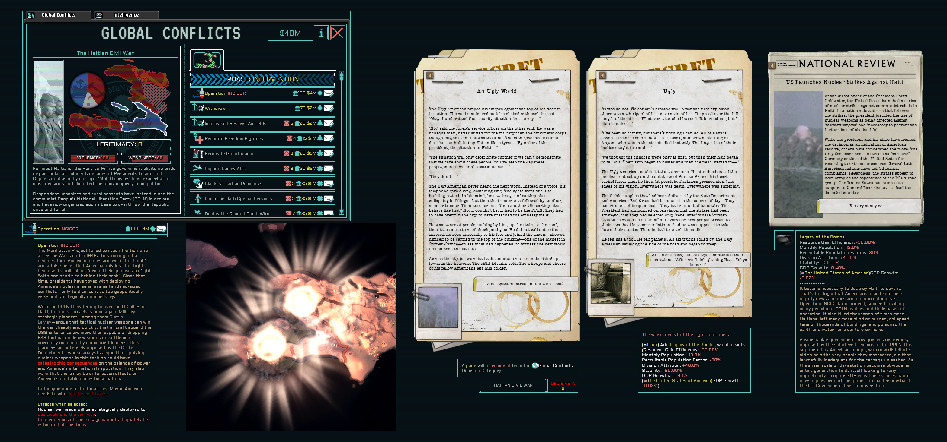 Nuking Haiti/Gorky is retarded and makes as much sense as a scenario where Reagan ragequits Grenada by nuking the place. It's like swatting flies using dynamite and both scenarios could easily be handled with a single brigade. At least use the nuclear card in a conflict with actual stakes. I think everyone talking about the military merits of nuking the world's poorest, tiniest and most useless shitholes miss the actual point of the act which is to serve as cheap shock value. Both events are only meant to make you feel like the country doing it is bad and nothing else was ever considered.I'm sure you could think of a lot of reasonable use cases in-universe but chief this ain't it and that's deliberate on part of the nudevs.