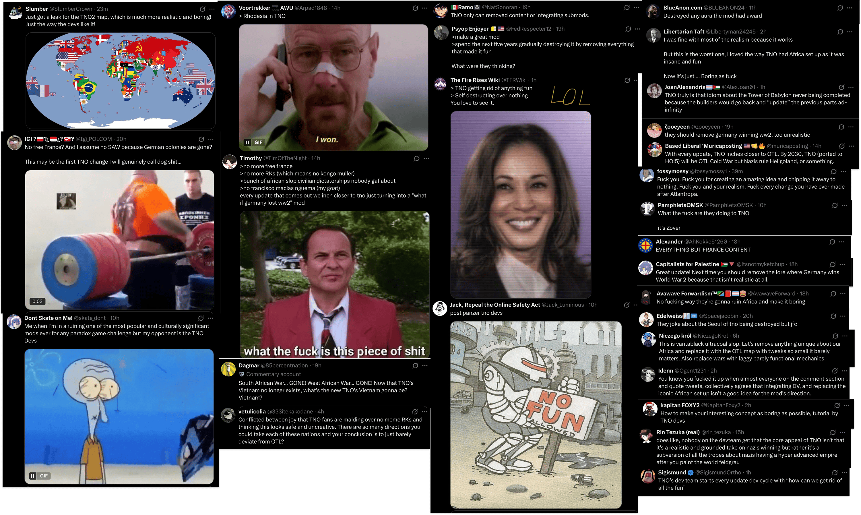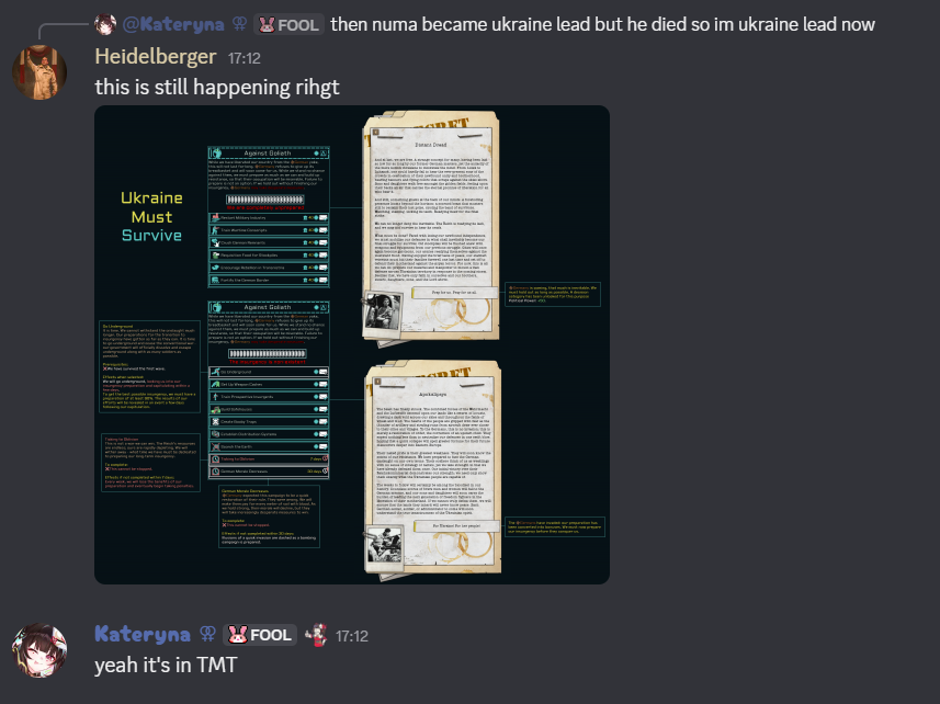 Stop me if you heard this before but we went two more months without updates.TNO devs have taken down some of these links. Will audit them once the leaks slow down.https://www.youtube.com/@ThomasLands - Leaked build footage. Nearly finished and scrapped Italy, very unfinished Germany/US reworks and more.https://space.bilibili.com/385529615/upload/opus - BiliBili leak video repository.https://files.catbox.moe/80z6tb.png - Bormann TNO2 flowchart (never releasing).https://files.catbox.moe/cdag1w.pdf - Vote Pig, the US rework proposal. Read all about this hot new TCT mod.https://files.catbox.moe/j8tp21.pdf - December 24 roundtable notes. Germany never.https://files.catbox.moe/zo5zhk.pdf - Post-Antarctica 25 roundtable notes. Bleak.https://files.catbox.moe/9320n5.pdf - Japan rework proposal.https://files.catbox.moe/chzsvc.pdf - Japan Funada Design Doc.https://files.catbox.moe/beh76f.pdf - France proposal. Nearly 200 pages, fucked by DV.https://files.catbox.moe/omzl7q.png - France flowchart. Resistance is dead.https://files.catbox.moe/xlhrjj.pdf - Sweden proposal. Dev has finally stopped posting here.https://files.catbox.moe/ycctp0.png - Sweden flowchart. We lost Pakt Sweden for this OTL-fest.https://files.catbox.moe/egf8m0.pdf - Charlemagne Insurrection proposal. Cut.https://files.catbox.moe/l70qhw.pdf - Burgundian Eulogy: A dev is made to justify why his own proposal got cut.https://files.catbox.moe/zff5y4.pdf - Serov "facelift" document. The first leg in the now confirmed Komi rework.https://files.catbox.moe/ymgaur.pdf - Amur rework doc. Three years in dev hell, still no release date.https://files.catbox.moe/vdpi8k.pdf - Red Italy proposal. Rest in peace, you were too good for this mod.https://files.catbox.moe/izg02l.png - 6th (?) space race mech rework mockup.