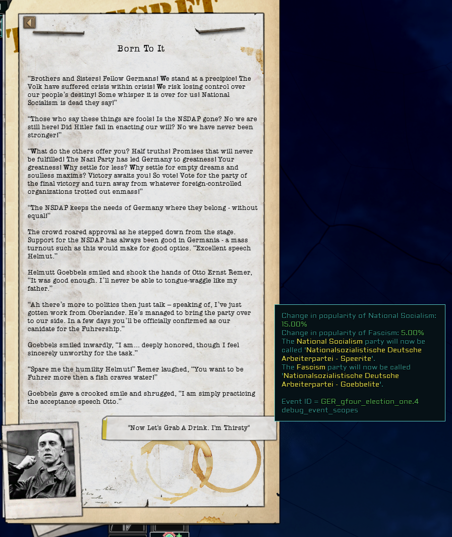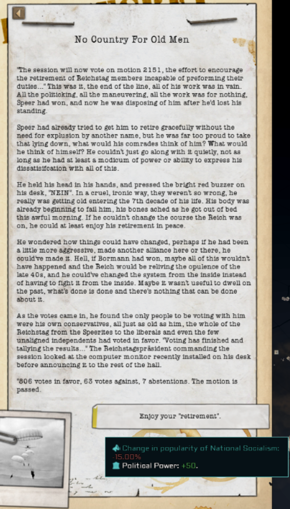 >>2377261Both Norway and Denmark have been out for ages. Denmark's just normal elections with one exception being that if you legalize porn and abortions there's a Nazi coup. Norway's just a rotating door of German puppets with the option to elect historical centrists that also end up being pro-German. The chart also had a walltext about a cod war mechanic with Britain which is just, lol. They actually thought Britain wasn't going to die.