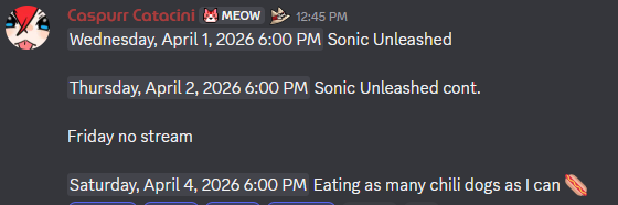 Caspurr Catacini [MEOW], Role icon, Wednesday, April 1, 2026 6:00 PM Sonic UnleashedThursday, April 2, 2026 6:00 PM Sonic Unleashed cont.Friday no streamSaturday, April 4, 2026 6:00 PM Eating as many chili dogs as I can