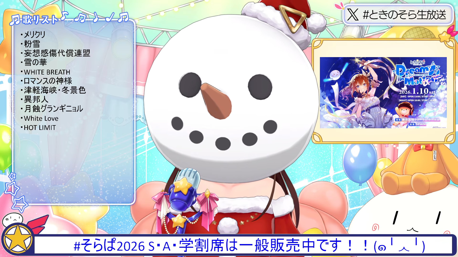 Merry Christmas EditionSoraPa 2024 (Daytime) Rebroadcast until January 9th: https://www.youtube.com/watch?v=Km_jZfAv1EIときのそら New Year's Party 2026『Dreams in Motion』 2025.01.10https://tokinosora-live.com/sorapa2026/Merchandise: https://victor-store.jp/special/tokinosora202601On-site Ticket: https://spwn.jp/_events/evt_Bqb0YLNmlJJFi1HgEdpVStreaming Ticket: https://spwn.jp/events/evt_MtTMNrakk8Fxk9WI2fjREarly Bird Ticket Sales period: 10.02(木) 21:00 〜 11.20(木) 23:59Merchandise pre-order period until 11.16 23:59 Latest Cover Song "一心不乱 (Isshinfuran) - Wholeheartedly" https://www.youtube.com/watch?v=KBDNxArtbOELatest Song "VirtuaReal Love" https://www.youtube.com/watch?v=TsFMmZcPH70Latest Album "Pulse" https://jvcmusic.lnk.to/Tokinosora_PulseComment too long. Click here to view the full text.