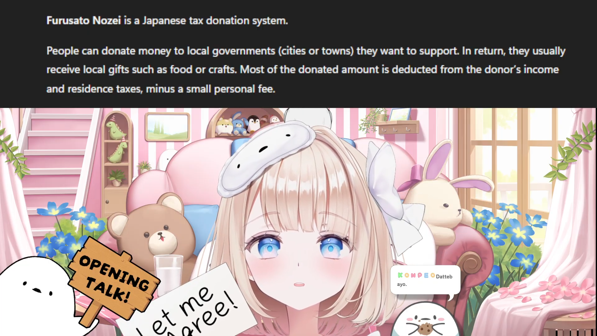 Peo just explained Furusato Nozei, since so many people have moved out of small country towns into cities and local towns have few young people and the governments are often poor. They have a system that lets Japanese people send tax money to those small local governments in exchange for getting occasional local goods from those places.