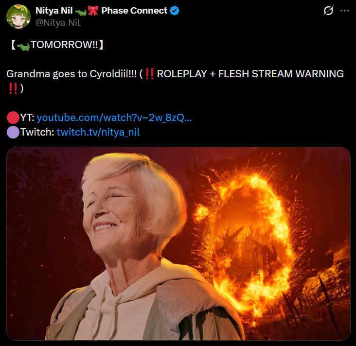 TOMORROW!!>Grandma goes to Cyroldiil!!! (!!ROLEPLAY + FLESH STREAM WARNING!!) https://x.com/Nitya_Nil/status/2040045836898357383