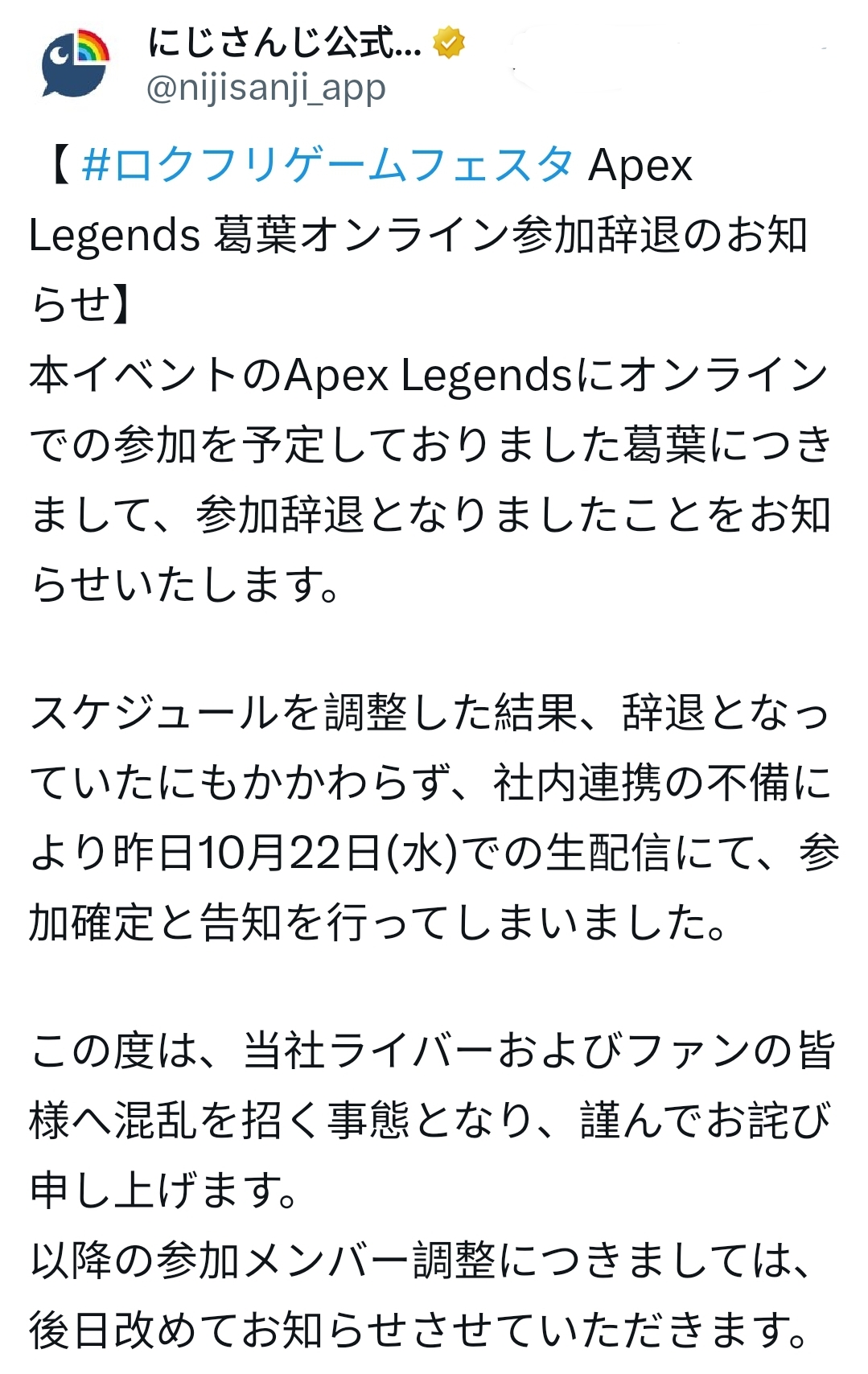 Apparently he was so busy that he chose to withdraw from an Apex tournament. And due to miscommunication internally, the management still added him in the promo as if he will join the tournament, and sisters are mad rightfully soThe idol activities and continuous Kuzuha promo spams now started to affect what he loves to do mosthttps://x.com/nijisanji_app/status/1981198941845934524