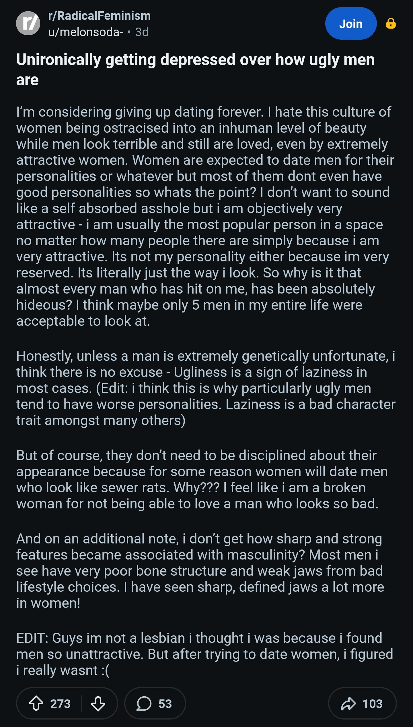 >>105770395I'm sorry to burst your bubble but most women hate us. That is just how it is. They think most of us are ugly, they are afraid of us, and now that on average women are making more money than men because they can sell their bodies on the internets or get high paying jobs because of DEI, they need us even less. That's why birth rates are so low.For the few women with dignity Vtubing was a godsend. Instead of OnlyFans now they could bait us into giving them our paychecks while hiding their real identity behind a cute anime girl avatar. If there is something Twitchcon has made clear is that they hate their fans and think we are gross and dangerous. Women hate us.