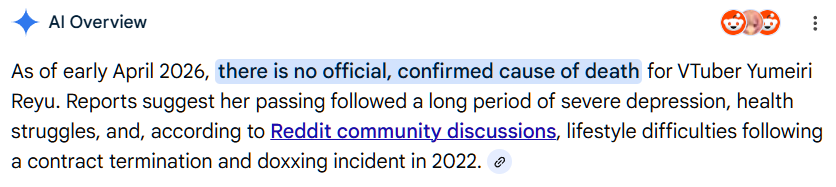 >MAHA5 announces that Yumeiri Reyu has passed as of 3/30. Per her family's wishes, all accounts will be deleted as of 4/30.