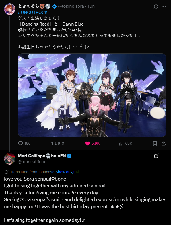 April Editionときのそら 8th Anniversary Party Starry Bl∞min' Live Blu-ray 2026.4.22 Release https://www.jvcmusic.co.jp/tokinosora/2528/buy/hololive 7th fes. Ridin' on Dreams STAGE2Free Segment: https://www.youtube.com/watch?v=Q9ACLUv90yI including MC segment with NeneStreaming Ticket: https://hololivesuperexpo.hololivepro.com/2026/en/ticket/SPWN: https://spwn.jp/_events/evt_26030602-enghololive7thfesStreaming+: https://ib.eplus.jp/hololive_7th_fes-st/Setlist: Saijoukyuu ni Kawaii no! (最上級にかわいいの!) with Iofi and Noel, DivaLatest Song "Diva" https://www.youtube.com/watch?v=sBm4KJD6P7QLatest Cover Song "限りなく灰色へ (Kagirinaku Haiiro e) - Close to gray" https://www.youtube.com/watch?v=vULnGIXpiZ0Latest Album "Pulse" https://jvcmusic.lnk.to/Tokinosora_PulseComment too long. Click here to view the full text.