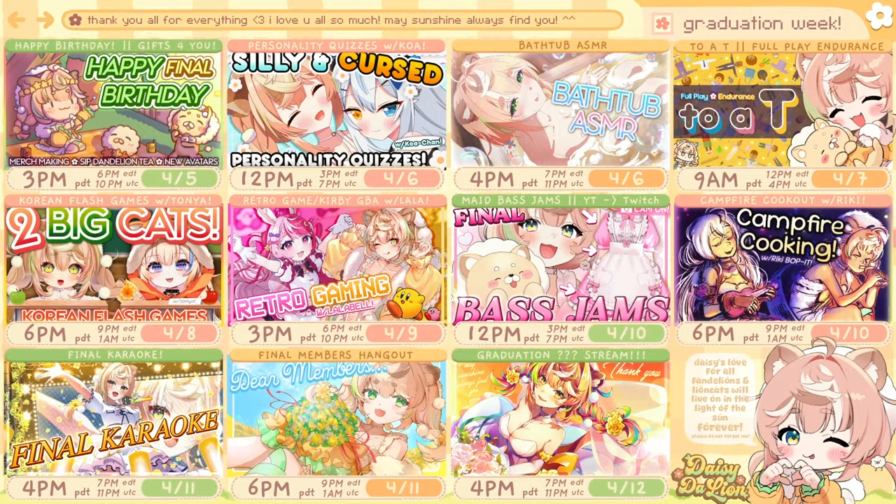 final daisy schedule>last birthday stream>collab w/ Koa Akugaki>bathtub ASMR>endurance gaming stream>collab w/ Tonya>retro gaming w/ Lalabell Lullaby>bass jams with maid cosplay on twitch>collab w/ Riki Poppet>last karaoke stream>last membership stream>farewell