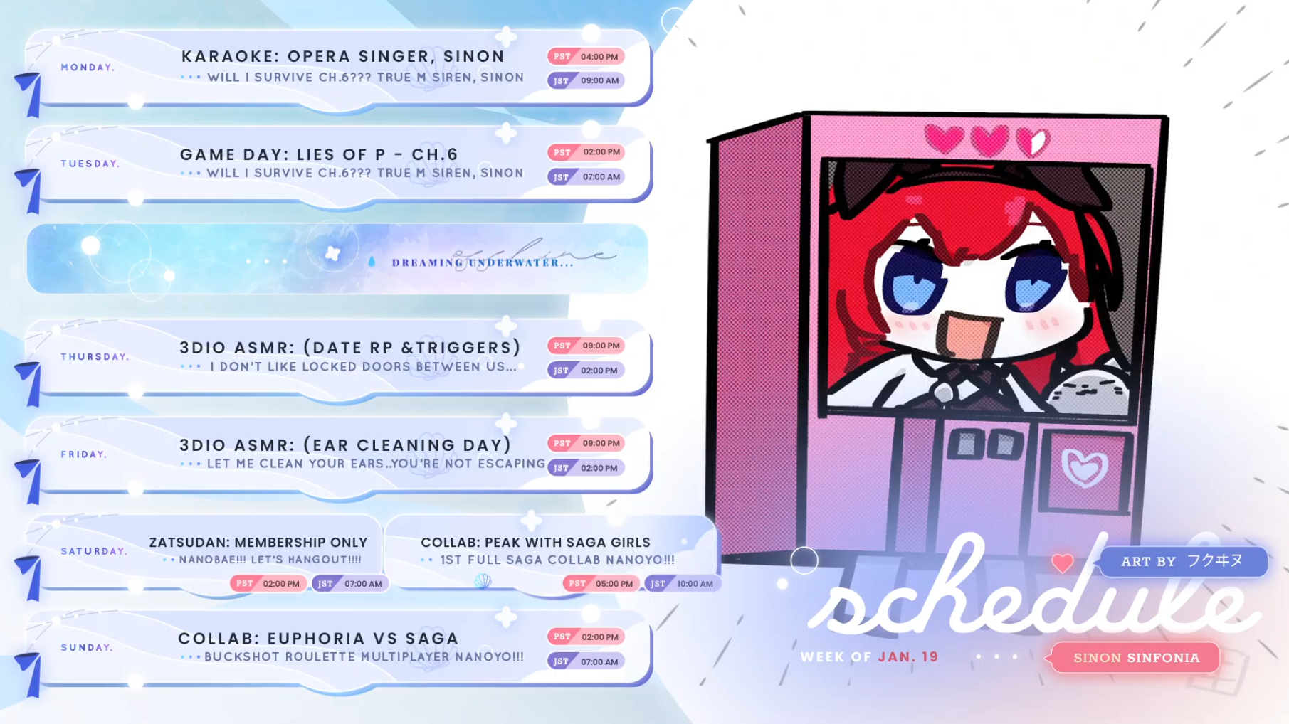 SA6A Edition!This is a thread for the members of Phase Connect's Saga generation.>Upcoming streams:https://pomu.pages.dev/saga>Links:- Bibi Biscuit | https://x.com/BibiBiscuitCh | https://www.youtube.com/@bibibiscuitch | https://www.twitch.tv/bibibiscuitch - Sinon Sinfonia | https://x.com/SinonSinfonia | https://www.youtube.com/@SinonSinfonia | https://www.twitch.tv/sinonsinfonia - Wilhelmina Frost | https://x.com/wilhelminafr0st | https://www.youtube.com/@wilhelminafrost | https://www.twitch.tv/wilhelminafrost - Anya Nyabyss | https://x.com/AnyaNyabyss | https://www.youtube.com/@AnyaNyabyss | https://www.twitch.tv/anyanyabyss - Malice Evermore | https://x.com/MaliceEvermore | https://www.youtube.com/@maliceevermore | https://www.twitch.tv/maliceevermore - Nitya Nil | https://x.com/Nitya_Nil | https://www.youtube.com/@Nitya_Nil | https://www.twitch.tv/nitya_nil Comment too long. Click here to view the full text.