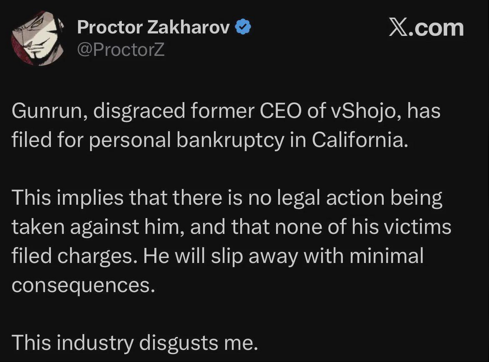 That's all, folks. Gunrun filed for bankruptcy, he will not be jailed for stealing money from charity and talents