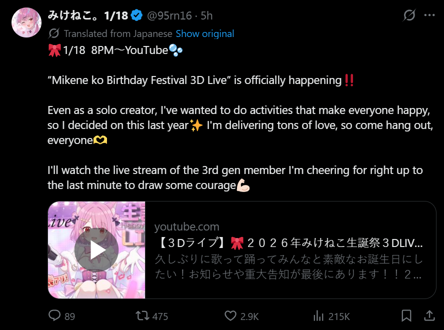 Thread to discuss the VSingers; the virtual singers of this industry. Originals, covers, utawakus, lives, etc., post them all here.Previous >>108442345Quick Vsinger primer: https://docs.google.com/document/d/e/2PACX-1vTBi4uaMG51lP8VQRTWpV1FE2itlmFAziaaeVOt1e5O-g7OksrVCgCEJ5FL5FUf40LpzJoZ1KUPdv3Q/pubUpcoming Lives:1/16: HACHI Birthday Live 2026 https://www.youtube.com/watch?v=kL9pza8dvzw1/17: Yuudutsu Tear x vortex Joint Live "Starlight Dream Festival" (LuicA, Anzu, Mieru, Tear, Rin, Fuwari) https://pjblue.zaiko.io/e/starlightfest1/17: TSUMITOBATSU Virtual mini Live 「Petalstride -青嵐-」 https://www.zan-live.com/en/live/detail/107121/18: にじさんじ WORLD TOUR 2025 Singin’ in the Rainbow! Tokyo Performance https://dwango-ticket.jp/project/GAh5hxbfiB1/25: Lir.E 2nd ONE-MAN LIVE 「愛について:REC」 https://pjblue.zaiko.io/item/3757551/25: JILL MITSUNOKI BIRTHDAY ONLINE LIVE 2026「Moonlight Magic」(Link TBA)1/26: Vack-ON!! Vol.9 https://eventa.zaiko.io/e/vackon9-show2/7: XASTAR 1st ONE-MAN LIVE 『paint the ANSWER』 https://eplus.jp/xastar/Comment too long. Click here to view the full text.