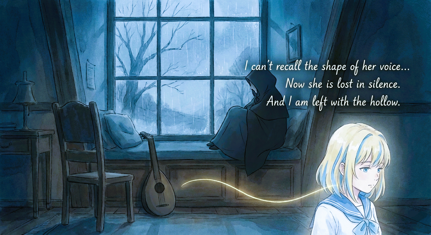 I can't recall the shape of her voice -- nor the lift of her first note, nor the angelic timbre that lingers after the lyrics end, like light refusing to leave. I can't remember how she made silence feel safe, how a single phrase could steady the heart, how her singing turned the world gentle, as if it had been forgiven.Now she is lost in silence. And I am left with the hollow.I drown in the quiet, with nothing between me and the ever-devouring void. No chorus, no warmth, no echo. Days fade to ash. Nights close like a fist. Yet still I hear her, crystal clear -- a thread of heaven in my waking ears, burning where she should be, just forever out of reach.