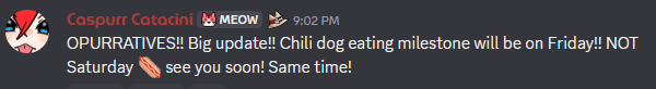 Speaking of the devil>OPURRATIVES!! Big update!! Chili dog eating milestone will be on Friday!! NOT Saturday see you soon! Same time!