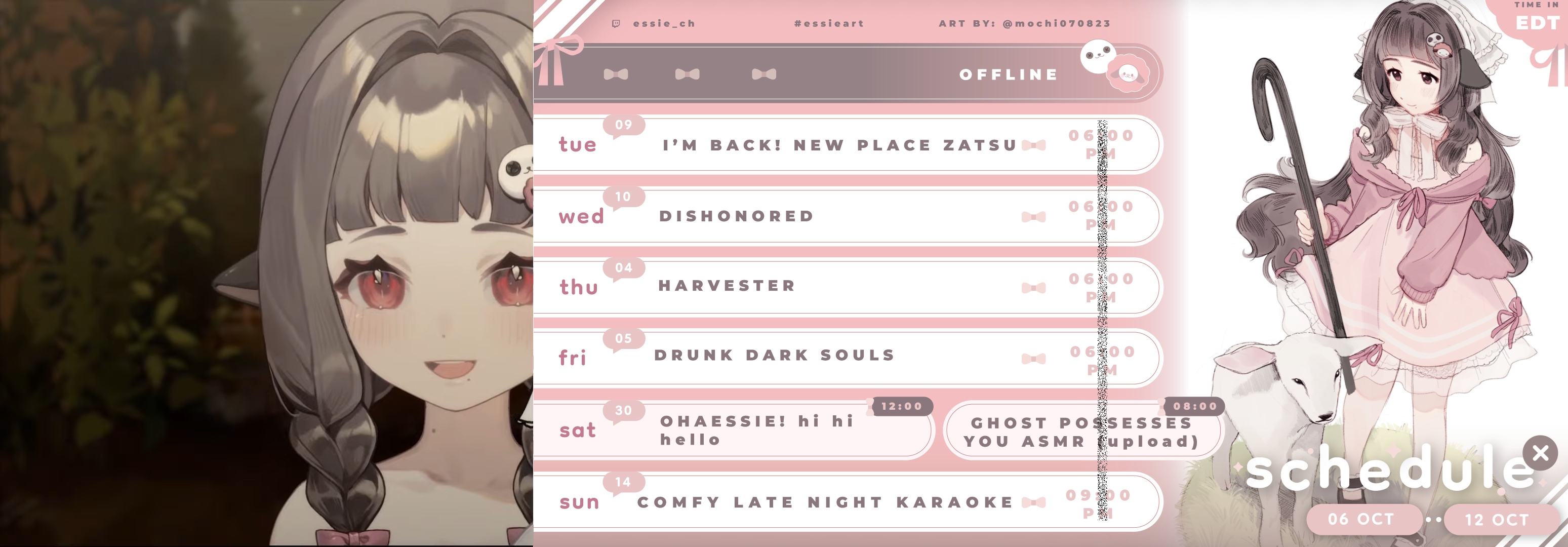 >>105267680>some weird named PARasi in chat>essie had her room made in 3D compatible with VRC and warudo>same artist who did pillow's room>going over schedule: streaming everyday>>yapping today>>dishonered, first time in forever>>harvester, excited for it>>drunk souls, after over a year>>morning stream + ojisan assmur>>comfy karaokeart by design mama licha