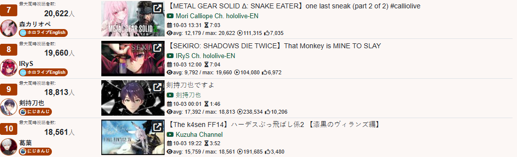 >>105270807OCT 2025 SILVER>1) 45,197: Miko (hololive) Hololive Koushien 2025 Sakurasaki HS Year 2>2) 30,541: Lauren (nijisanji) GTA5 MADTOWN>3) 47,275: Koyori (hololive) Hololive Koushien 2025 BBQ>4) 49,718: Subaru (hololive) Naruto Shippuden: Ultimate Ninja Storm 4 finale>5) 59,159: Ren Kisaragi (VSPO) VSPO pop quiz>6) 28,030: Miko (hololive) Oshaberi king>7) 28,578: Ririka (hololive) Hololive Koushien 2025 GENKAIJO HS Year 2> PER COMPANY5x: hololive1x: nijisanji1x: VSPO> PER STREAMER2x: Miko1x: Lauren, Koyori, Subaru, Ren Kisaragi, Ririka