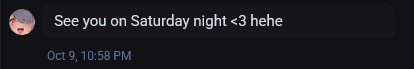 >>105407633Fansly DM on Thursday, October 9 at 10:58 PM: "See you on Saturday night <3 hehe" >>105404657