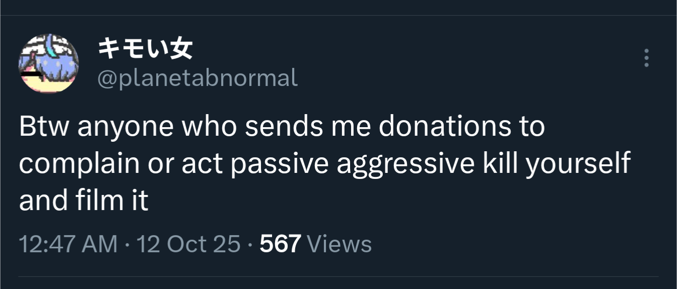 i donated just before that tweet. it definitely wasn't directed at me (i think) because i've never complained or put her down, but i'm scared now that she might have misinterpreted what i wrote as being passive-aggressive when that wasn't my intention. that timing will have me fucked up for a good while. my immediate thought was to start sending donos without a message for a while to be safe, but couldn't that be seen as passive-aggressive too? I CAN'T STOP OVERTHINKING