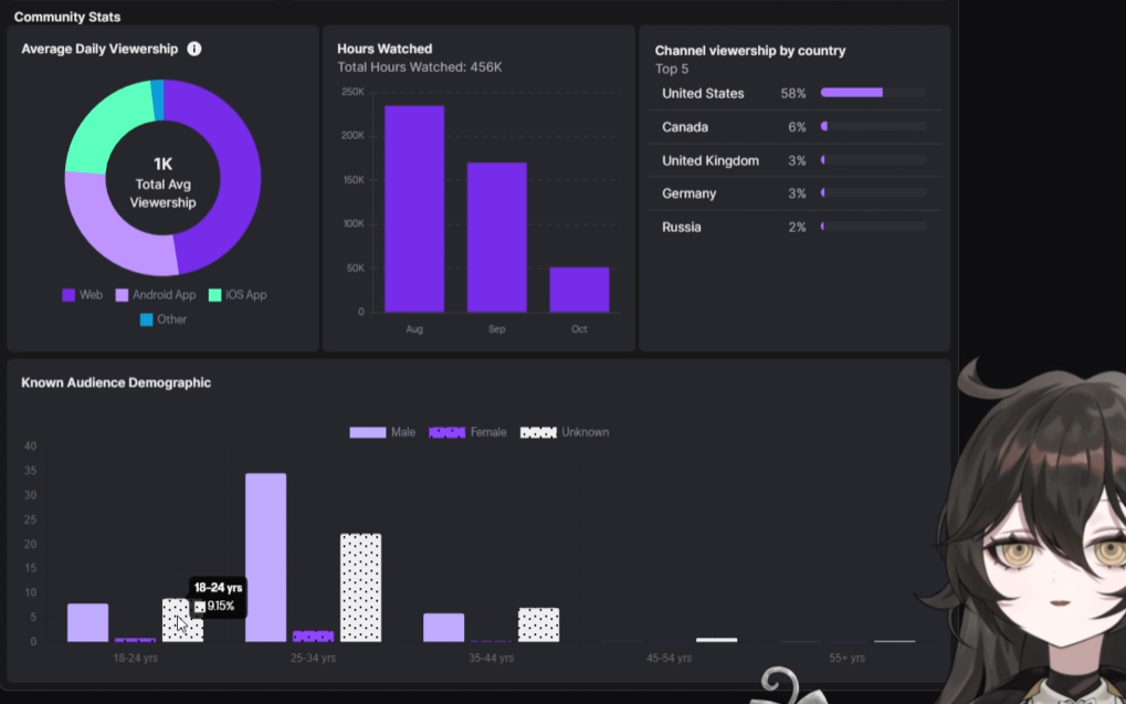 >>105449687Numbers for 10/12:1: https://www.youtube.com/@SamekoSaba (14,194)2: https://twitch.tv/vedal987 (8,404)3: https://twitch.tv/ironmouse (8,299)4: https://www.youtube.com/@niminightmare (5,683)5: https://twitch.tv/Shylily (3,921)6: https://twitch.tv/Zentreya (3,528)7: https://twitch.tv/Kenji (3,150)8: https://twitch.tv/anny (3,104)9: https://twitch.tv/henyathegenius (2,904)10: https://twitch.tv/chibidoki (2,695)Non-English:1: https://www.youtube.com/@Ririka_krmzw0707 (7,037) *Japanese2: https://twitch.tv/Kamito_JP (4,308) *Japanese3: https://twitch.tv/akamikarubi (2,756) *Japanese