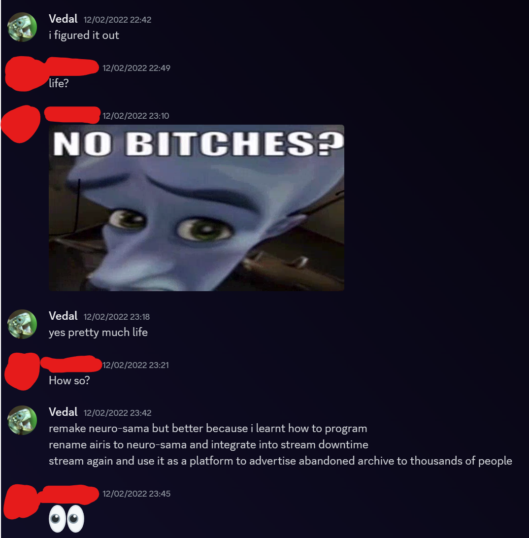If I was Vedal I'd collect nudes from ever vtuber possible and leak them before disappearing forever