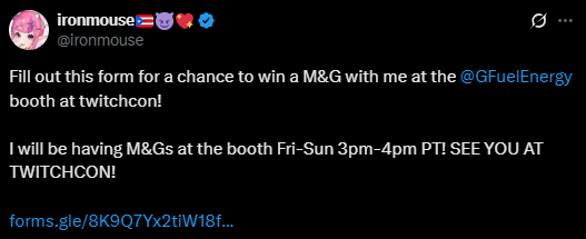 If anyone's going to Twitchcon and wants a chance to M&G Mouse there's your chance to win one https://twitter.com/ironmouse/status/1977949450954821725