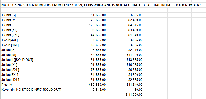 >>105472399sweater stocksS 0 (-1)M 14 (-1)L 12 (-1)XL 18 (-1)2XL 12 (-2)3XL 8 (+7)**Either they found new stock or I fucked up last time somehow. Or maybe someone had it in their cart and then it expiredShirt preordersS 20 (+0)M 30(+2)L 21 (+2)XL 16 (+0)2XL 9 (+2)3XL 8 (0)
