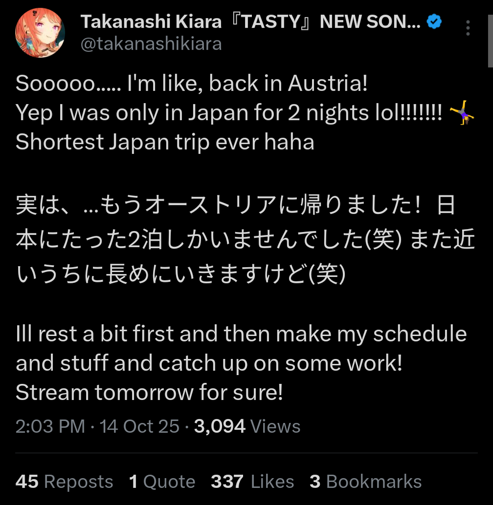 I hope Kiara is doing well and has fun in japan