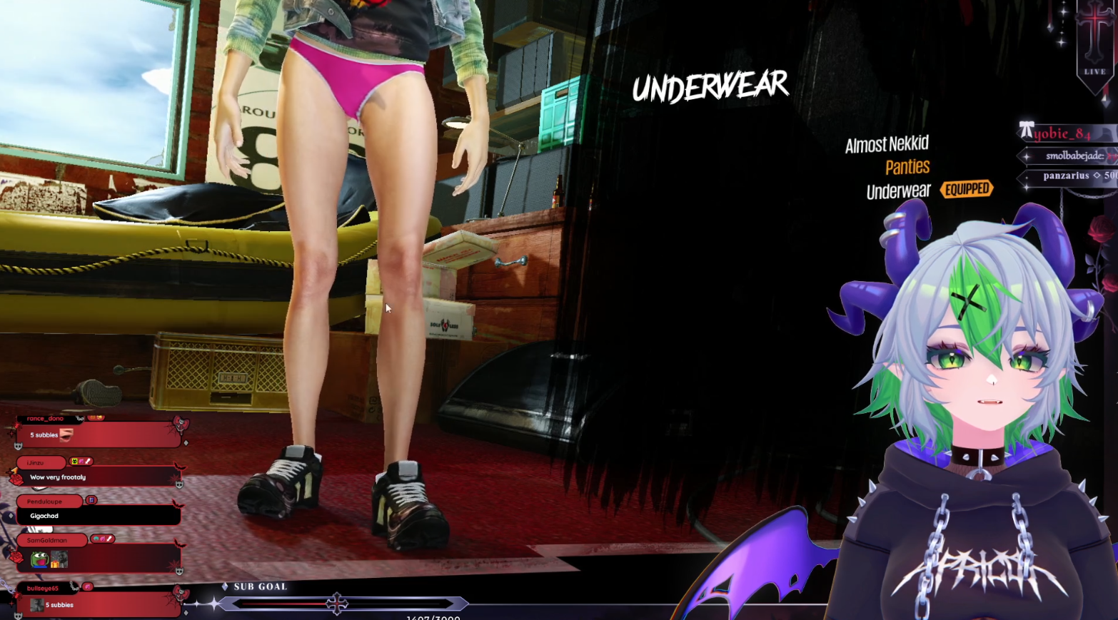 >>105495980It wouldn't surprise me if even though Froot wears all goth clothes she actually wears bright pink panties just like that.