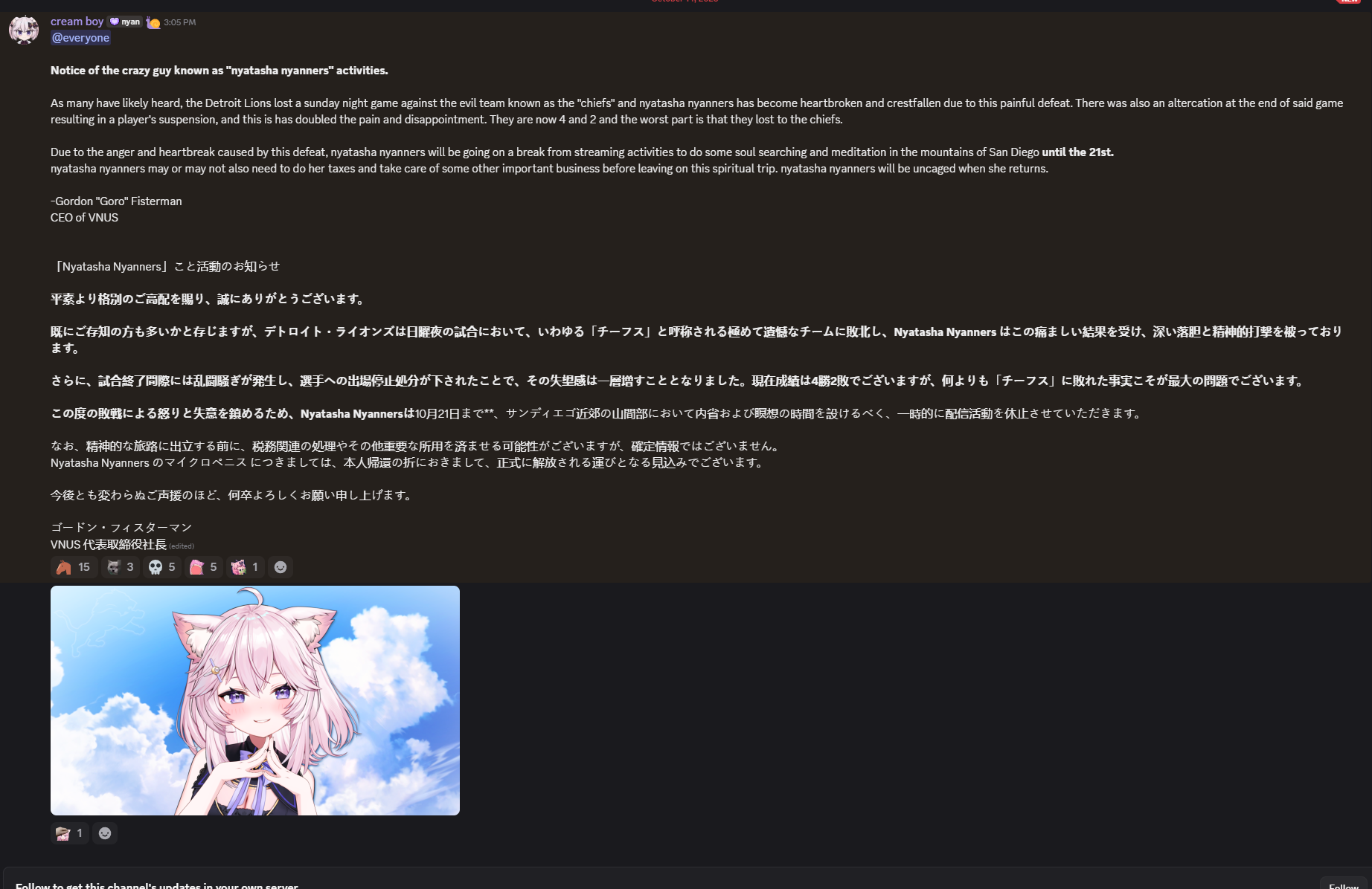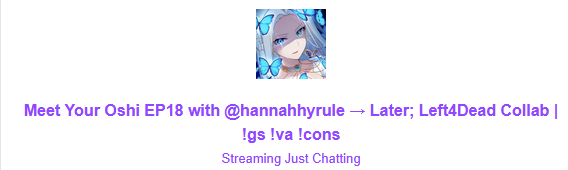 WAKE UP SAMURAI EditionWelcome to /xvsj+/! A thread to discuss vtubers who were once associated with a hot pink company.Froot is LIVE! And is yapping. She just showed a pic of a bunch of naked muscular men on stream so that was fun. Hotaru and Peke are also LIVE! And are playing the One Piece TCG. Together, even. Hotaru WILL get all of her friends into her special interest. Nagi is also LIVE! And is playing some Peak. No idea who the people she's playing with but she is definitely pushing people off ledges. Finally Hestia is LIVE! And is grinding in Marvel Rivals. Not sure who she's playing with either. That's it for now so pick a stream and keep things comfy and civil by ignoring and especially reporting bait, and being excellent to each other.Image source: https://x.com/Surazaki_Kei/status/1977403036411789576/xvsj+/ includes:Amalee - https://www.twitch.tv/leeandlieFroot - https://www.twitch.tv/apricotGeega - https://www.twitch.tv/geegaHaruka - https://www.twitch.tv/harukakaribuHenya - https://www.twitch.tv/henyathegeniusHestia - https://www.twitch.tv/hestiahappinessHime - https://www.twitch.tv/hajimeHotaru - https://www.twitch.tv/akatsukidhotaruKson - https://www.twitch.tv/ksonsouchouKuro - https://www.twitch.tv/k9kuroMata - https://www.twitch.tv/matarakanMel - https://www.twitch.tv/projektmelodyMichi - https://www.twitch.tv/michimochieveeMouse - https://www.twitch.tv/ironmouseNagi - https://www.twitch.tv/NagIsekaiedNazuna - https://www.twitch.tv/amemiyanazunaNyan - https://www.twitch.tv/nyannersPeke - https://www.twitch.tv/pekeispeakSilver - https://www.twitch.tv/silvervaleVei - https://www.twitch.tv/veiZen - https://www.twitch.tv/zentreyaRelated /in/dies:Beri - https://www.twitch.tv/beribugTori - https://www.twitch.tv/toriorianeMint - https://www.youtube.com/@mintfantomeFeebee - https://www.twitch.tv/feebeePia - https://www.twitch.tv/piapiufoMomo - https://www.twitch.tv/momoRelated:/999/ + /総長/ + /nova/ + /voms/ for Japanese talents once associated with a hot pink company/lig/ and /big/ for more generalized + and friends discussionPrevious thread: >>105484992