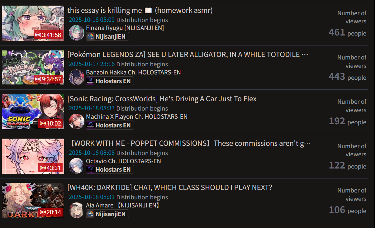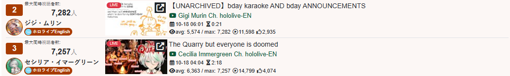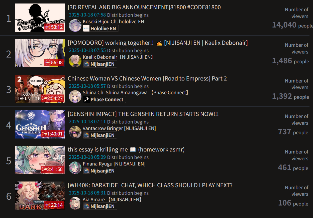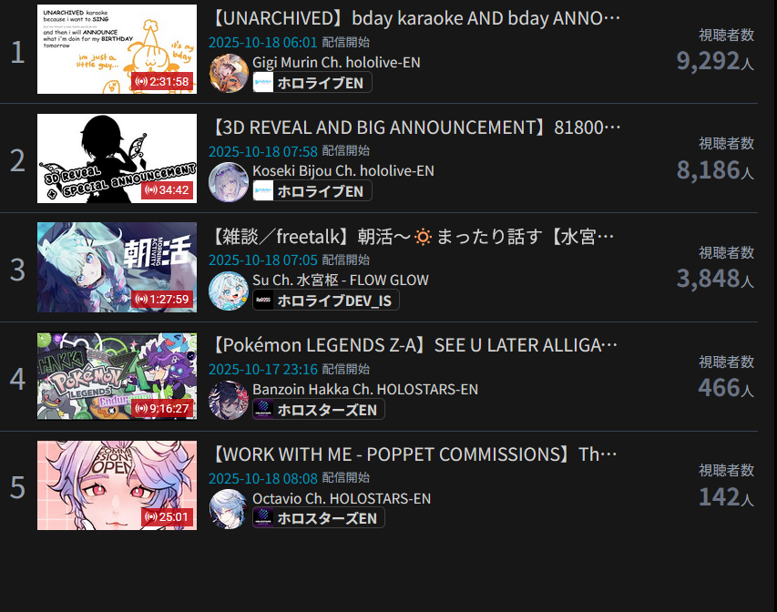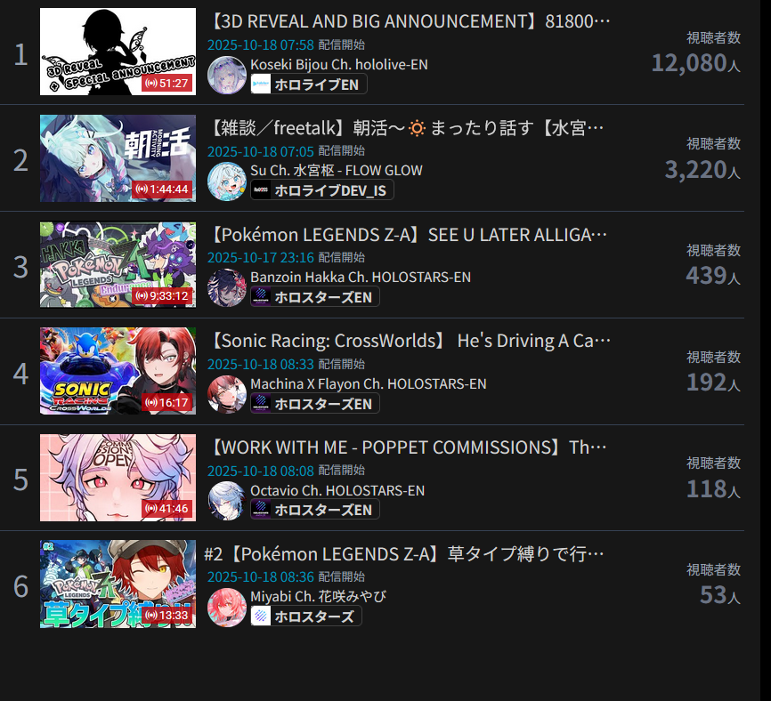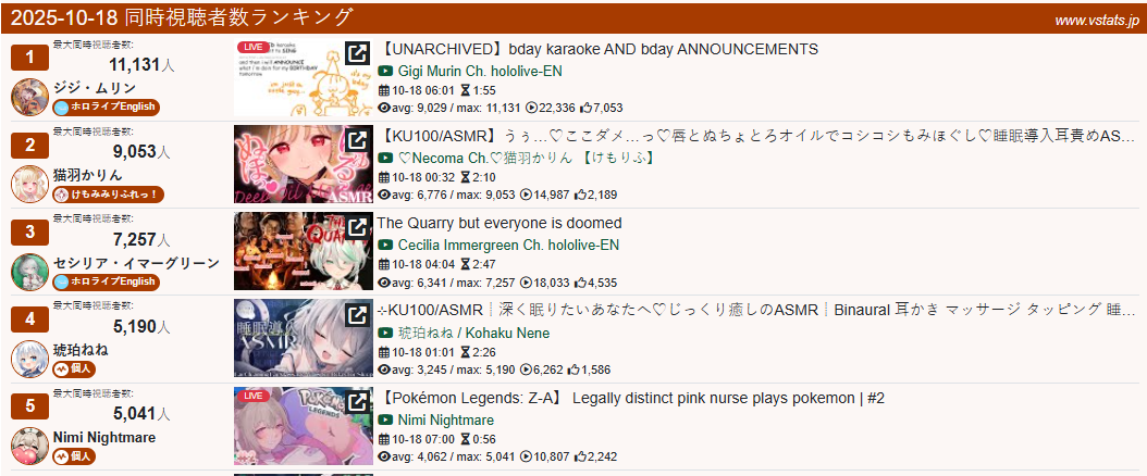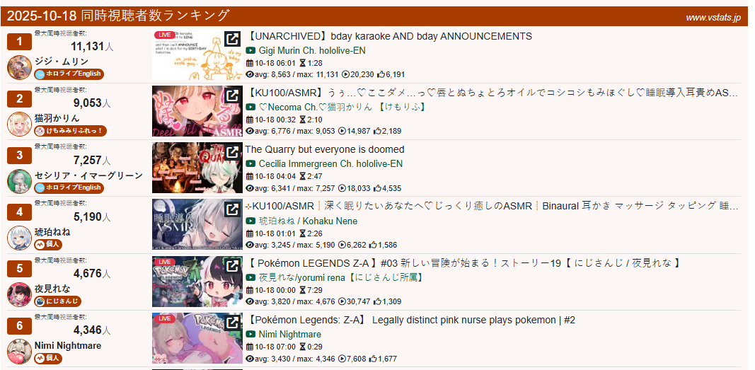 >>105602510OCT 2025 SILVER>1) 45,197: Miko (hololive) Hololive Koushien 2025 Sakurasaki HS Year 2>2) 30,541: Lauren (nijisanji) GTA5 MADTOWN>3) 47,275: Koyori (hololive) Hololive Koushien 2025 BBQ>4) 49,718: Subaru (hololive) Naruto Shippuden: Ultimate Ninja Storm 4 finale>5) 59,159: Ren Kisaragi (VSPO) VSPO pop quiz>6) 28,030: Miko (hololive) Oshaberi king>7) 28,578: Ririka (hololive) Hololive Koushien 2025 GENKAIJO HS Year 2>8) 45,257: Miko (Hololive)>9) 32,991: Gwelu (Nijisanji)>10) 38,032: Lauren (Nijisanji)>11) 45,458: Miko (Hololive)>12) 29,548: Lauren (Nijisanji)>13) 47,563: Kuzuha (Nijisanji)>14) 37,704: Miko (Hololive)>15) 41,741: Miko (Hololive)>16) 43,590: Chiroru (Indie) >17) 36,226: Pekora (Hololive)> PER COMPANY10x: hololive5x: nijisanji1x: VSPO1x: Indie6x: Miko1x: Lauren, Koyori, Subaru, Ren Kisaragi, Ririka, Gwelu, Lauren, Kuzuha, Chiroru, Pekora