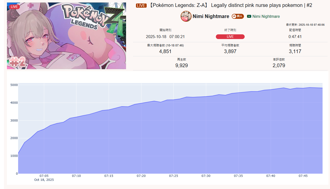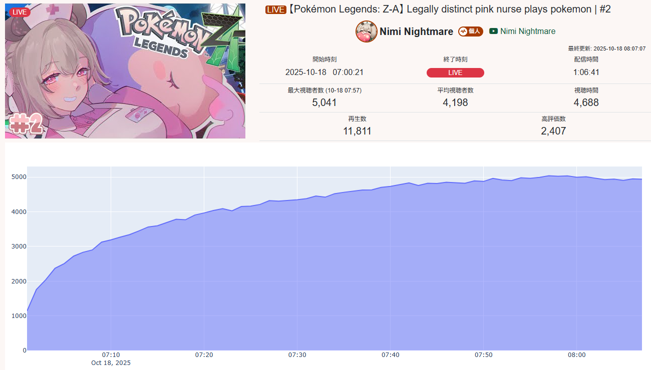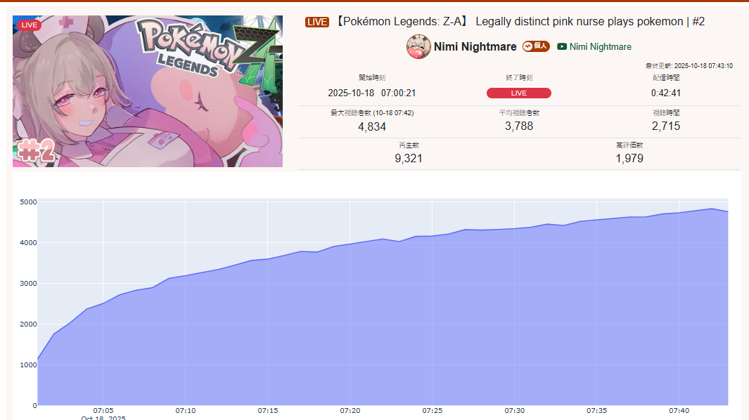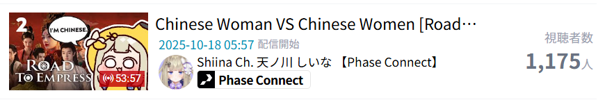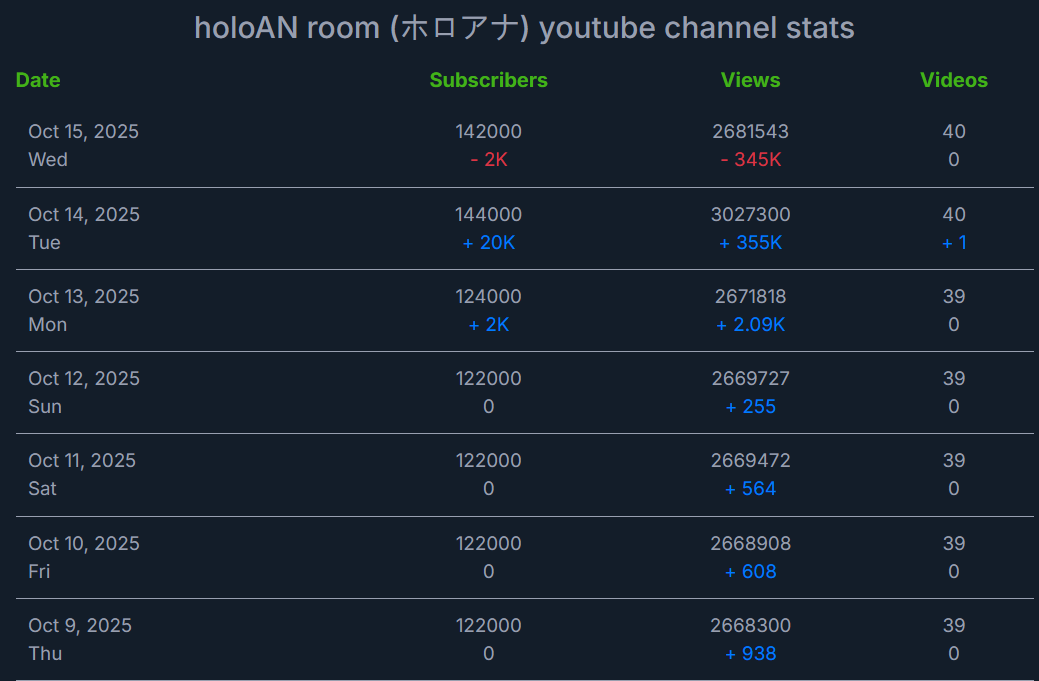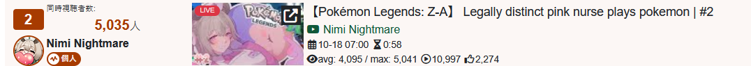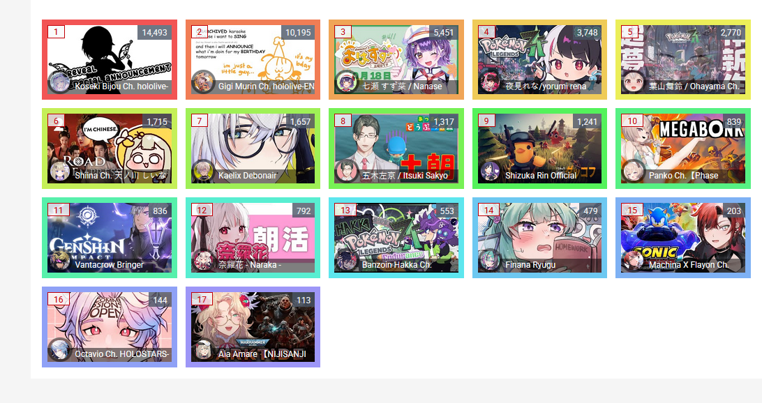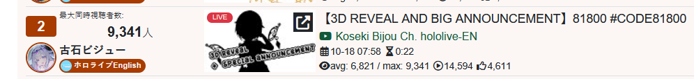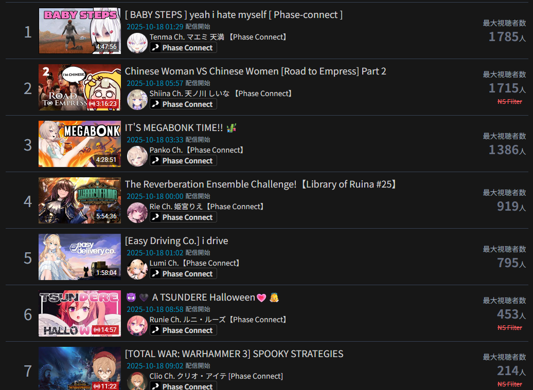 >>105602510OCT 2025 SILVER>1) 45,197: Miko (hololive) Hololive Koushien 2025 Sakurasaki HS Year 2>2) 30,541: Lauren (nijisanji) GTA5 MADTOWN>3) 47,275: Koyori (hololive) Hololive Koushien 2025 BBQ>4) 49,718: Subaru (hololive) Naruto Shippuden: Ultimate Ninja Storm 4 finale>5) 59,159: Ren Kisaragi (VSPO) VSPO pop quiz>6) 28,030: Miko (hololive) Oshaberi king>7) 28,578: Ririka (hololive) Hololive Koushien 2025 GENKAIJO HS Year 2>8) 45,257: Miko (Hololive)>9) 32,991: Gwelu (Nijisanji)>10) 38,032: Lauren (Nijisanji)>11) 45,458: Miko (Hololive)>12) 29,548: Lauren (Nijisanji)>13) 47,563: Kuzuha (Nijisanji)>14) 37,704: Miko (Hololive)>15) 41,741: Miko (Hololive)>16) 43,590: Chiroru (Indie) >17) 36,226: Pekora (Hololive)> PER COMPANY10x: hololive5x: nijisanji1x: VSPO1x: Indie6x: Miko1x: Lauren, Koyori, Subaru, Ren Kisaragi, Ririka, Gwelu, Lauren, Kuzuha, Chiroru, Pekora