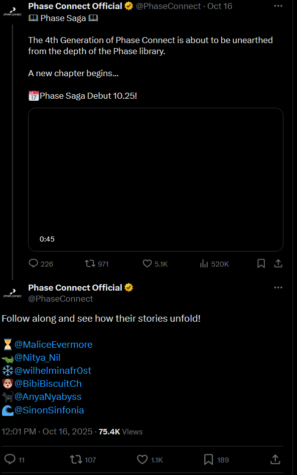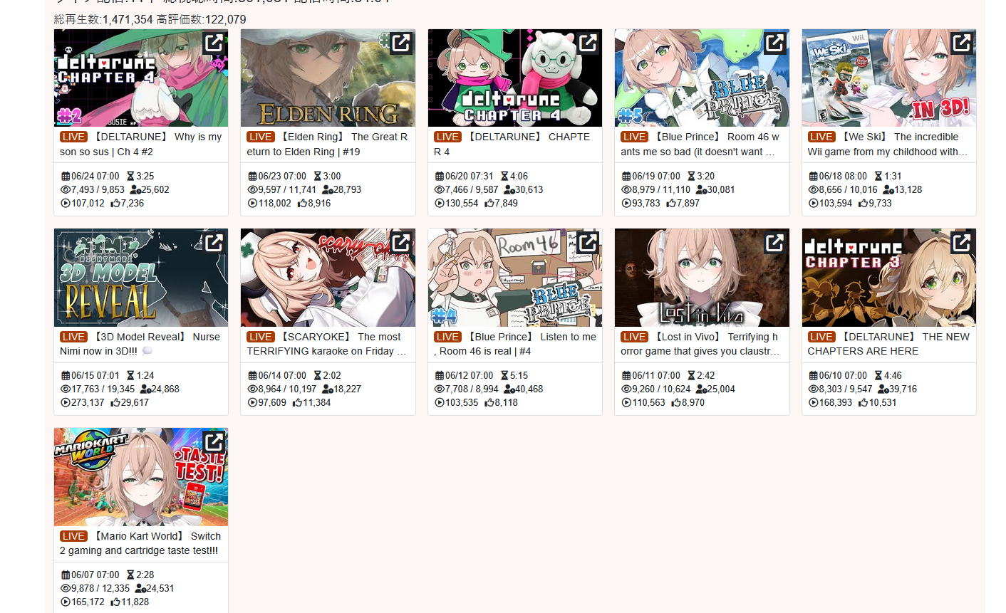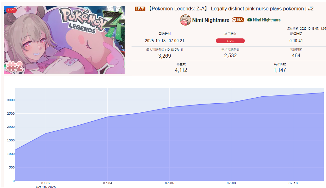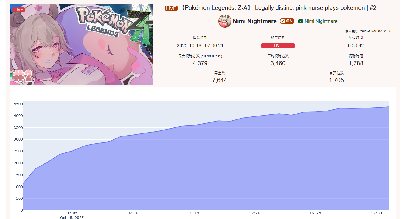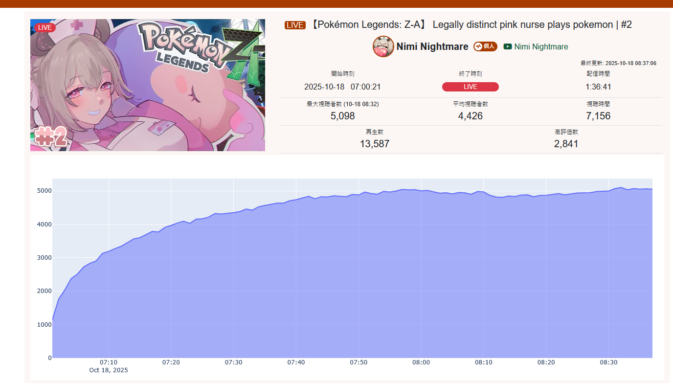 >>105602510OCT 2025 SILVER>1) 45,197: Miko (hololive) Hololive Koushien 2025 Sakurasaki HS Year 2>2) 30,541: Lauren (nijisanji) GTA5 MADTOWN>3) 47,275: Koyori (hololive) Hololive Koushien 2025 BBQ>4) 49,718: Subaru (hololive) Naruto Shippuden: Ultimate Ninja Storm 4 finale>5) 59,159: Ren Kisaragi (VSPO) VSPO pop quiz>6) 28,030: Miko (hololive) Oshaberi king>7) 28,578: Ririka (hololive) Hololive Koushien 2025 GENKAIJO HS Year 2>8) 45,257: Miko (Hololive)>9) 32,991: Gwelu (Nijisanji)>10) 38,032: Lauren (Nijisanji)>11) 45,458: Miko (Hololive)>12) 29,548: Lauren (Nijisanji)>13) 47,563: Kuzuha (Nijisanji)>14) 37,704: Miko (Hololive)>15) 41,741: Miko (Hololive)>16) 43,590: Chiroru (Indie) >17) 36,226: Pekora (Hololive)> PER COMPANY10x: hololive5x: nijisanji1x: VSPO1x: Indie6x: Miko1x: Lauren, Koyori, Subaru, Ren Kisaragi, Ririka, Gwelu, Lauren, Kuzuha, Chiroru, Pekora