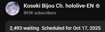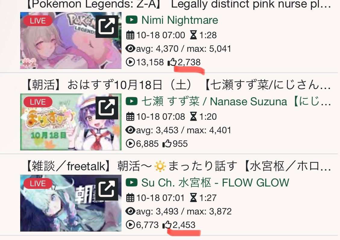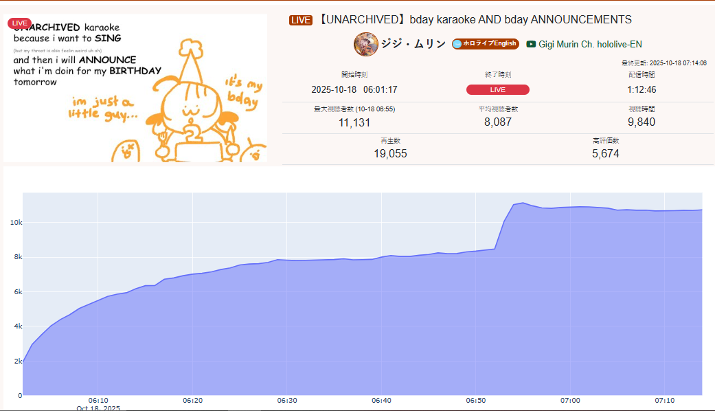 >>105602482OCT 2025 GOLD>1) 92,847: Korone (hololive) birthday collab stream [18]>2) 68,374: Suisei (hololive) Important Announcement + new miComet outfit reveals [24]>3) 69,410: Miko (hololive) FubuMio vs miComet clubhouse 51 [23]>4) 49,837: Miko (hololive) Hololive Koushien 2025 Sakurasaki HS Year 2 [25]>5) 105,025: Fubuki (hololive) 3DLIVE Birthday [32]>6) 40,093: Marine (hololive) Hololive Koushien 2025 AHOY Academy Year 3 [19]>7) 34,747: Pekora (hololive) Marika DX8 [17]>8) 52,995: Subaru (Hololive)>9) 95,687: Kuzuha (Nijisanji)>10) 55,693: Luna (Hololive)>11) 91,899: Kuzuha (Nijisanji)>12) 33,396: Miko (Hololive)>13) 53,372: Miko (Hololive)>14) 43,646: Kuzuha (Nijisanji)>15) 72,432: Pekora (Hololive)>16) 50,072: Subaru (Hololive)>17) 65,244: Miko (Hololive)> PER COMPANY14x: Hololive3x: Nijisanji> PER STREAMER5x: Miko3x: Kuzuha2x: Pekora, Subaru1x: Korone, Suisei, Fubuki, Marine, Luna