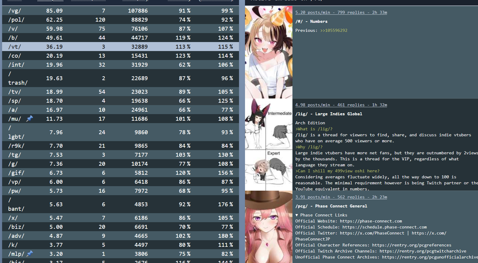 *GENERAL NUMBERFAG SITES*>https://playboard.co/en/>http://ikioi-ranking.com/>https://vrabi.net/>https://www.vstats.jp>https://live-ranking.userlocal.jp/vtuber-ranking>https://vt.poi.cat/Hololive sites>https://www.hololyzer.net/youtube/index.html>https://trackholo.live/en/>https://holo-spotify-stats.jirikunes.eu/Twitch sites>https://sullygnome.com/>https://twitchtracker.com/>https://stats.roki.sh/>https://streamscharts.com/