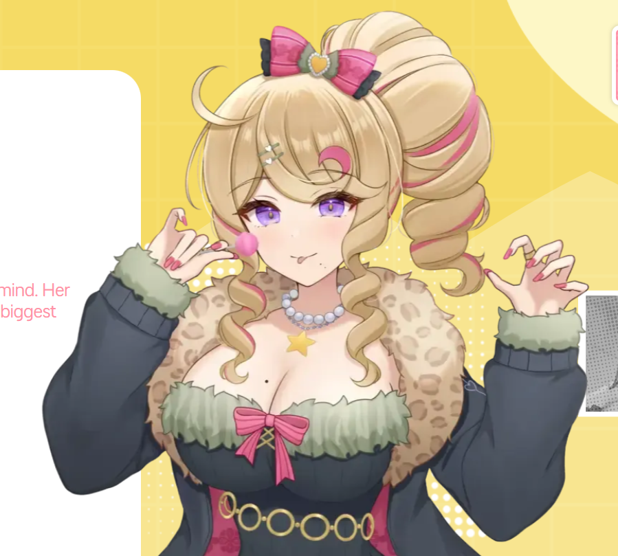 >>105663784No lantinas>LemiSnail scientist, does educational shorts about bugs, pretty comfy>PerryLoud, toilet humor, variety content, occasional role play streams which are always good>YuiBaking content, general gaming, likes to organize big events, comfy>TokaYappy theater kid, every stream is at least an hour of yapping about whatever, eternally sick and always sniffling>RinaSuoer relaxing content, ASMR, analog horror, generally just quiet cozy vibes >SerenaShe just really really wants to be an idol, lots of covers, lots of karaoke, plays a bunch of competitive games but sucks at all of them>GaomiHasn't been around much because of her life basically exploding, general content, loud, more twitch streamer vibes>NanaShe doesn't shower and wants you to punch her in the stomach