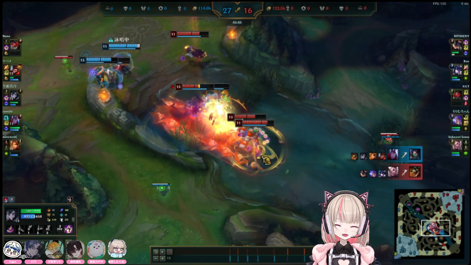 ririmu dancing while listening and then she proposing key words to signal communication in team fights so if Fight then fight! so they can engage much cleaner, also usami getting tips on how to place his rumble ult in team fights to be on top of his team's CC they practice engage