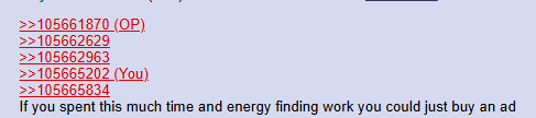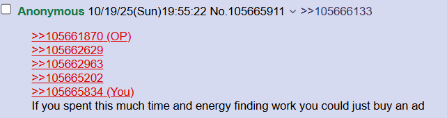 >>105661870>>105662629>>105662963>>105665202>>105665834If you spent this much time and energy finding work you could just buy an ad