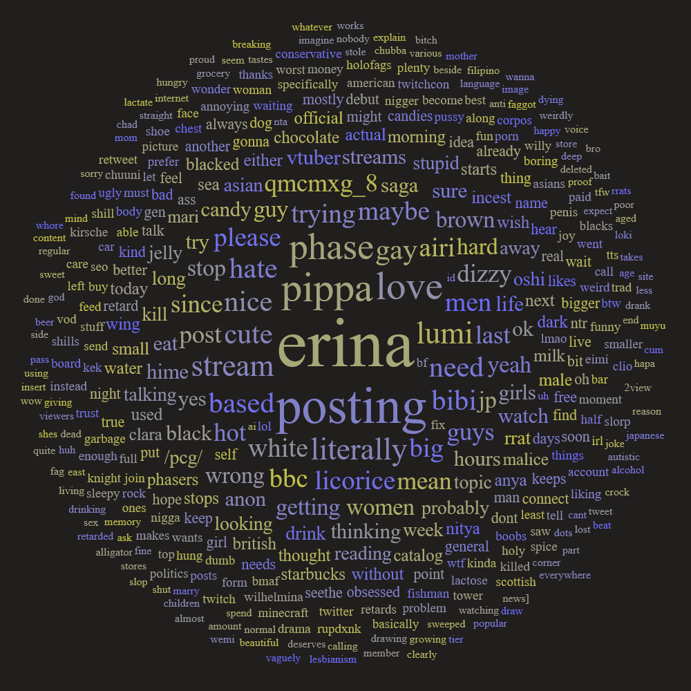 >>105670771idk about airi but erina's seems pretty chill. I heard it was a lot worse for all of alias when they debuted cause mods were sniping everyone and everything and no one wanted to type
