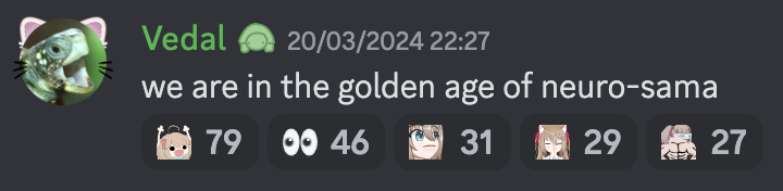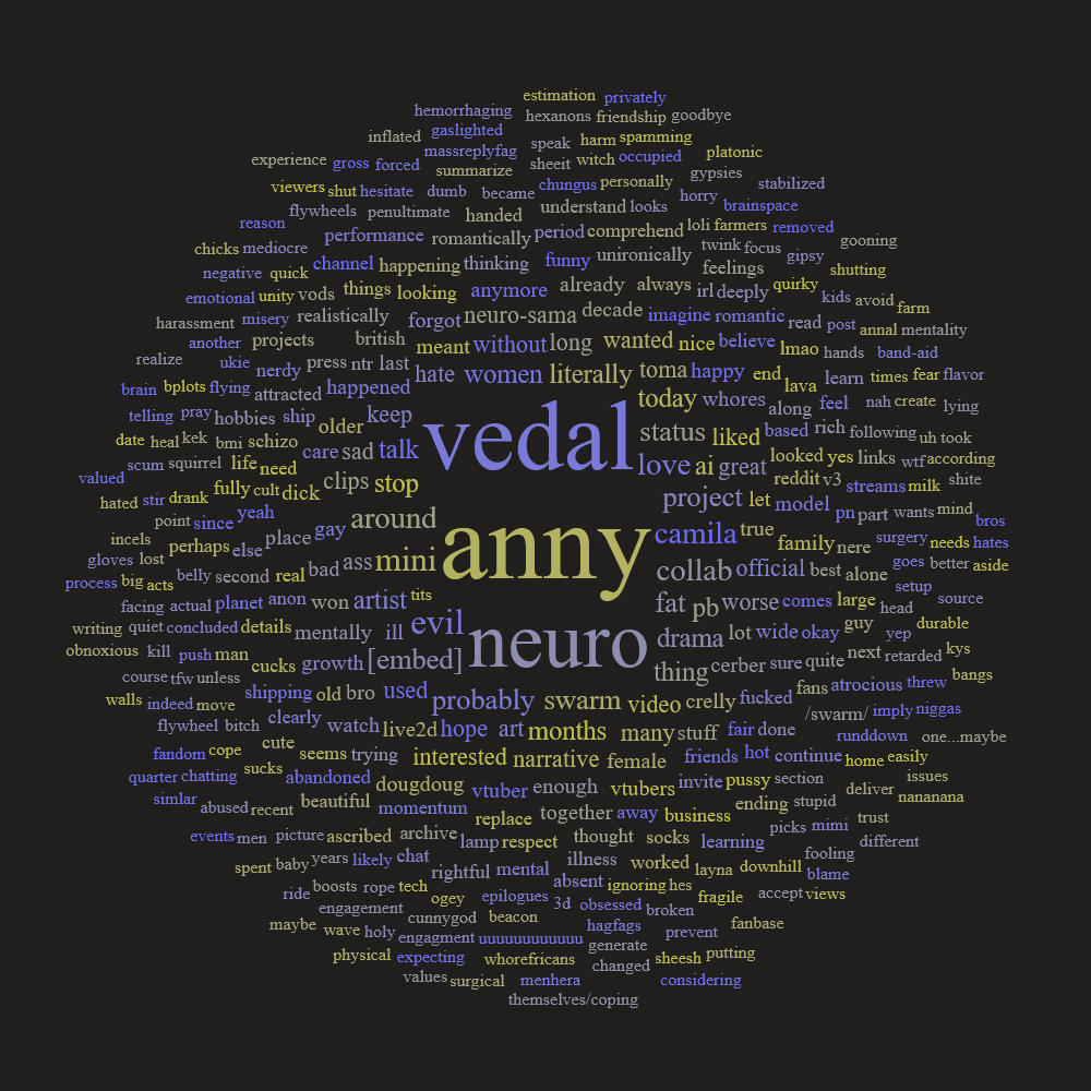 wtf there actually isn't any drama. every swarmie message is pretty much one of two things>awwww that sucks :( that makes me sad :( but oh well>damn vedal fumbledand that's itactually a fucking nothingburger. anny isn't working on neuro, as if that hasn't been the case for the entire year. spectacular