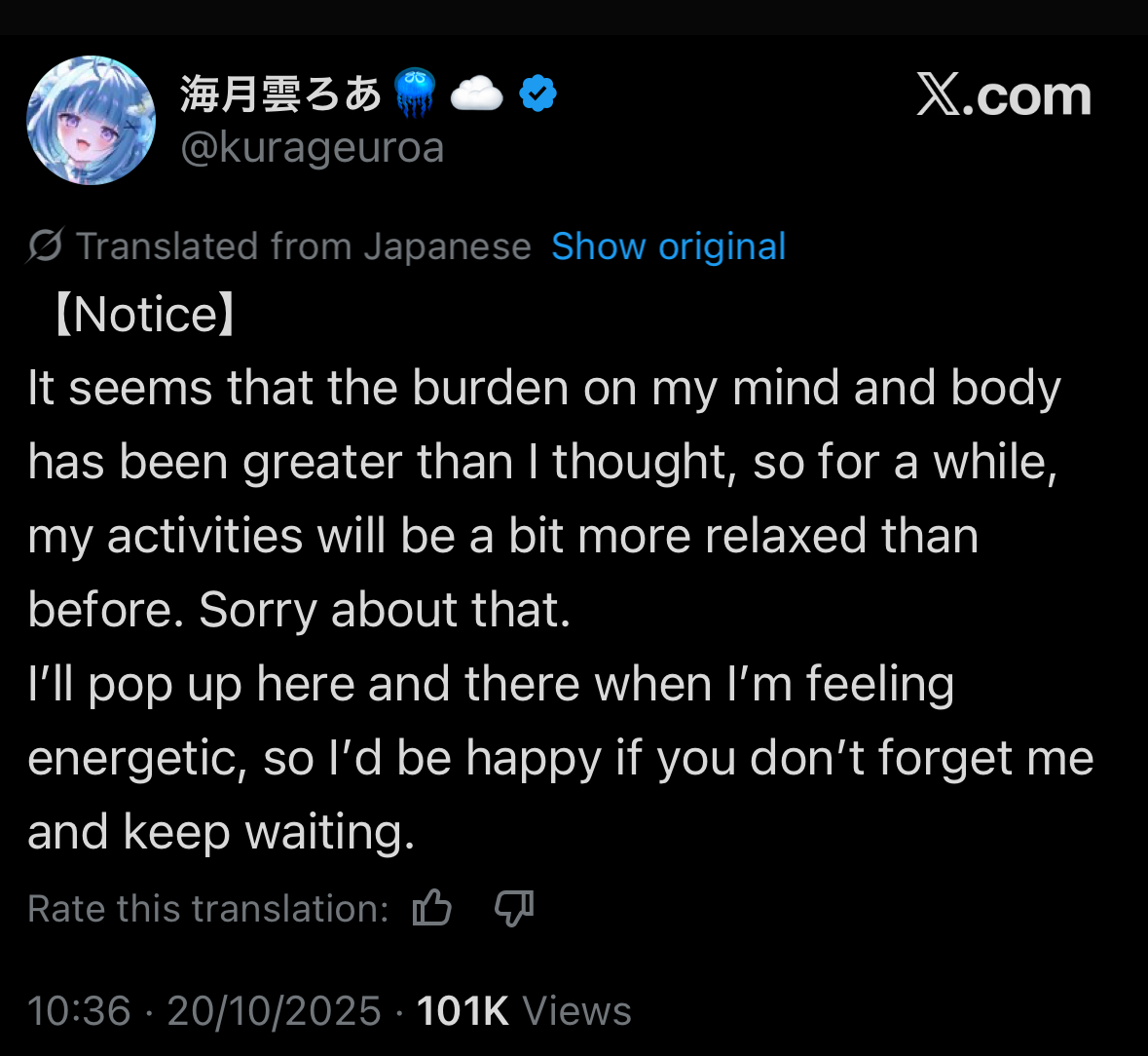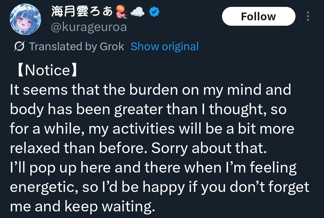 >Roa's already burnt out No wonder she quit hololive if she's this ficklehttps://x.com/kurageuroa/status/1980206549546217897