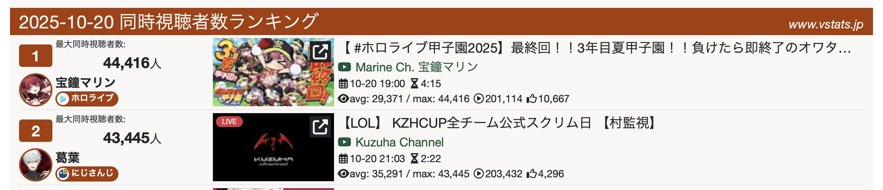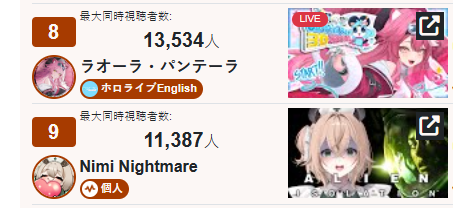 >>105704363*GENERAL NUMBERFAG SITES*>https://playboard.co/en/>http://ikioi-ranking.com/>https://vrabi.net/>https://www.vstats.jp>https://live-ranking.userlocal.jp/vtuber-ranking>https://vt.poi.cat/Hololive sites>https://www.hololyzer.net/youtube/index.html>https://trackholo.live/en/>https://holo-spotify-stats.jirikunes.eu/Twitch sites>https://sullygnome.com/>https://twitchtracker.com/>https://stats.roki.sh/>https://streamscharts.com/