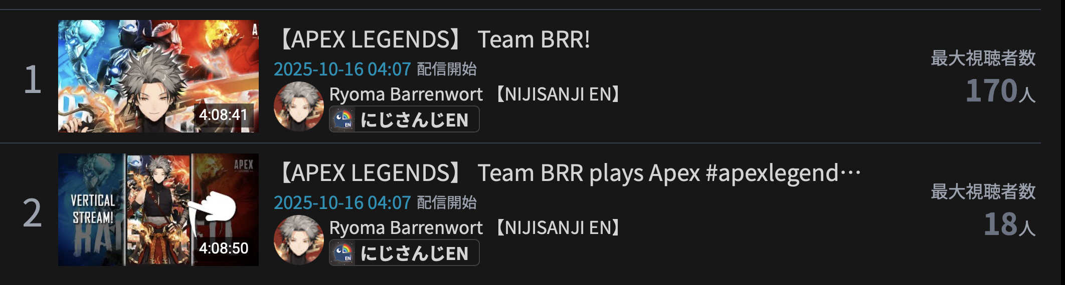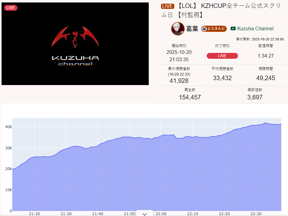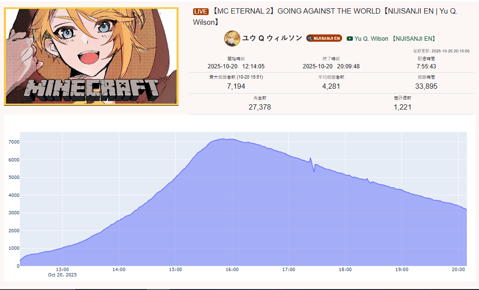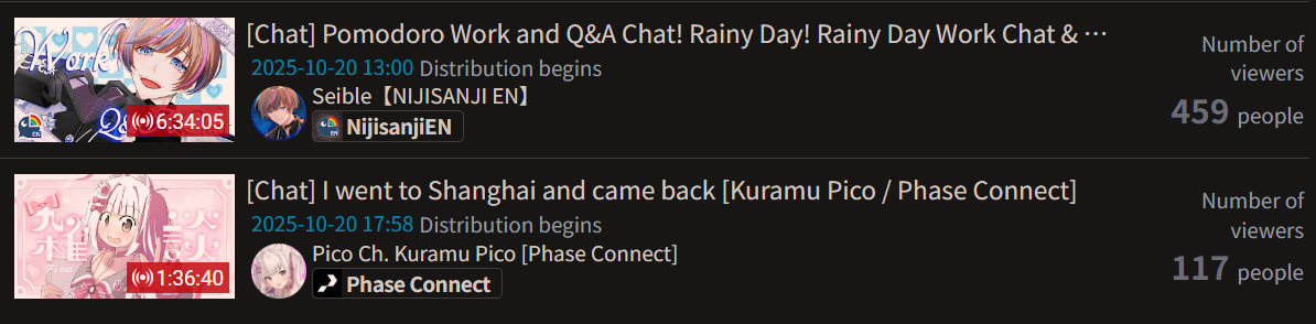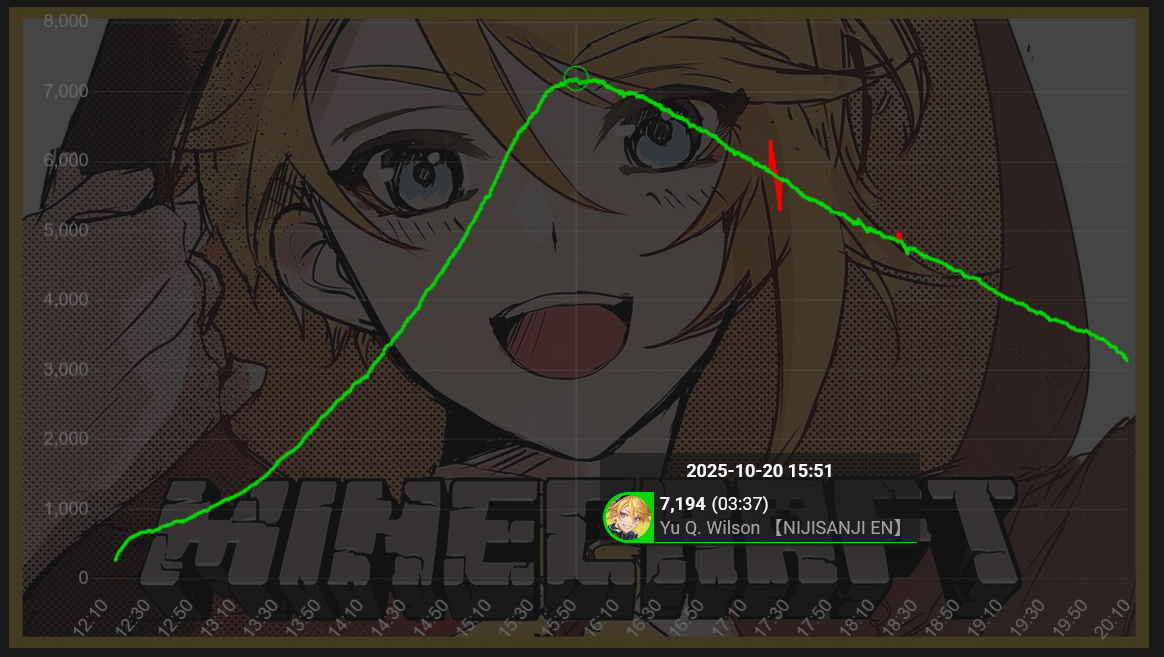 >>105710089OCT 2025 Floor tally>1) 10,480: Fuwa (nijisanji) nijiMUFG [18]>2) 11,103: Ina (hololive) Inacademy: Drawing [24]>3) 10,700: Nene (hololive) TCG Card Shop Simulator [23]>4) 10,956: Kagami (nijisanji) Pokemon Trading Card Game Pocket [25]>5) 10,377: Cammy (nijisanji) Niji mahjong L league coach room [32]>6) 11,019: Bae (hololive) Stellar Blade [19]>7) 10,124: Luna (hololive) MonHun Wilds [17]>8) 10,220: Koyori (Hololive)>9) 10,070: Ibrahim (Nijisanji)>10) 10,129: Ina (Hololive)>11) 10,169: Ars (Nijisanji)>12) 10,554: Ririca (Indie)>13) 10,025: Laplus (Hololive)>14) 10,094: Hinano (VSPO)>15) 11,226: Watame (Hololive) >16) 11,028: Ibrahim (Nijisanji)>17) 10,422: Mio (Hololive) >18) 10,492: Kagami (Nijisanji)>19) 10,067: Koyori (Hololive)> PER COMPANY7x: nijisanji10x: hololive1x: Indie1x: VSPO