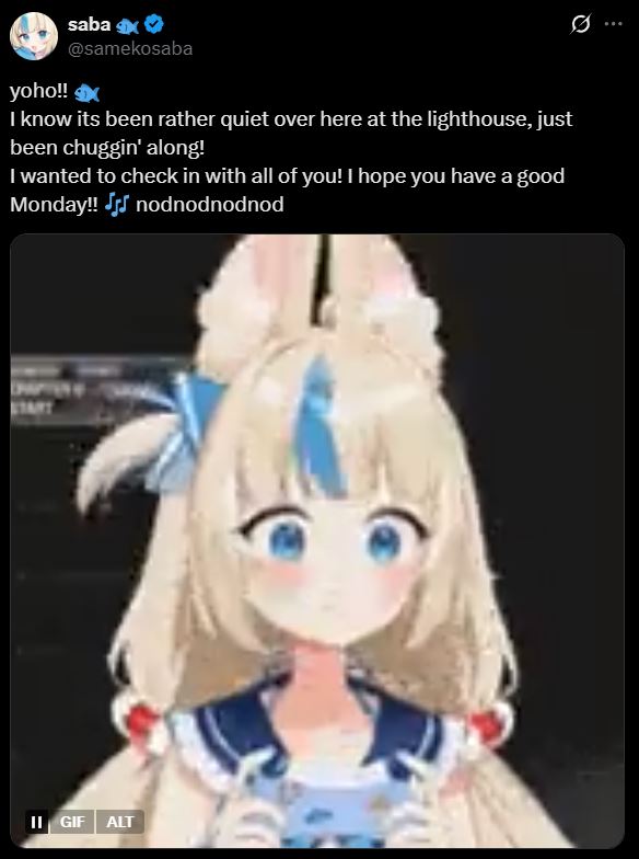>Wow, Saba remembered to tweet something about her lack of streaming this time, im so happyKanikis are hilarious, they are the reason she will never get better