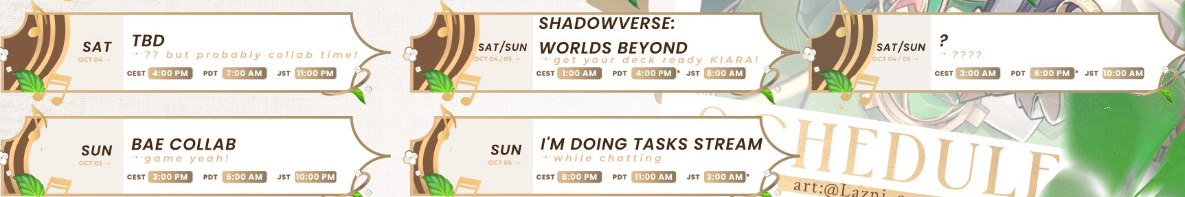 Zeitplan>Thur: Mage Arena HoloEN>Fri: Bae collabThe rest TBA