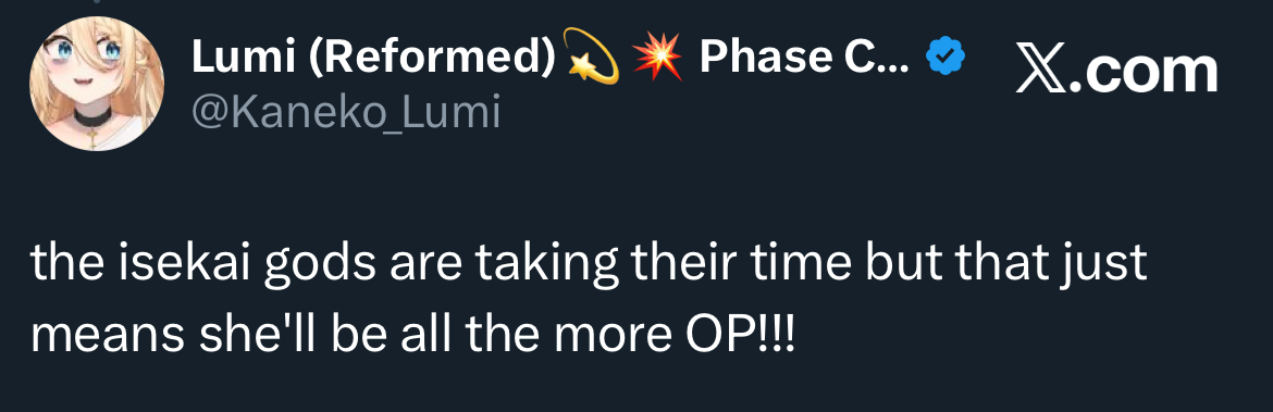 Don’t you trust Lumi?She wouldn’t lead us astray right?Anya WILL debut in time.https://x.com/kaneko_lumi/status/1981040069243961444