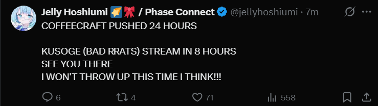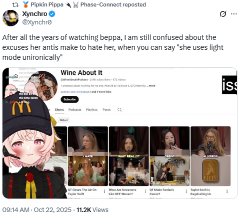>>105787280More like:>Yuri sues Phase for her IP>After 2 years she wins the case>Vageposts about it on twitter>Hime responds on her alt>Yuri decides to delete her comment, she already won>Yuri account is revived>Phase anounced some bad news>Yuri takes the opportunity to mock them