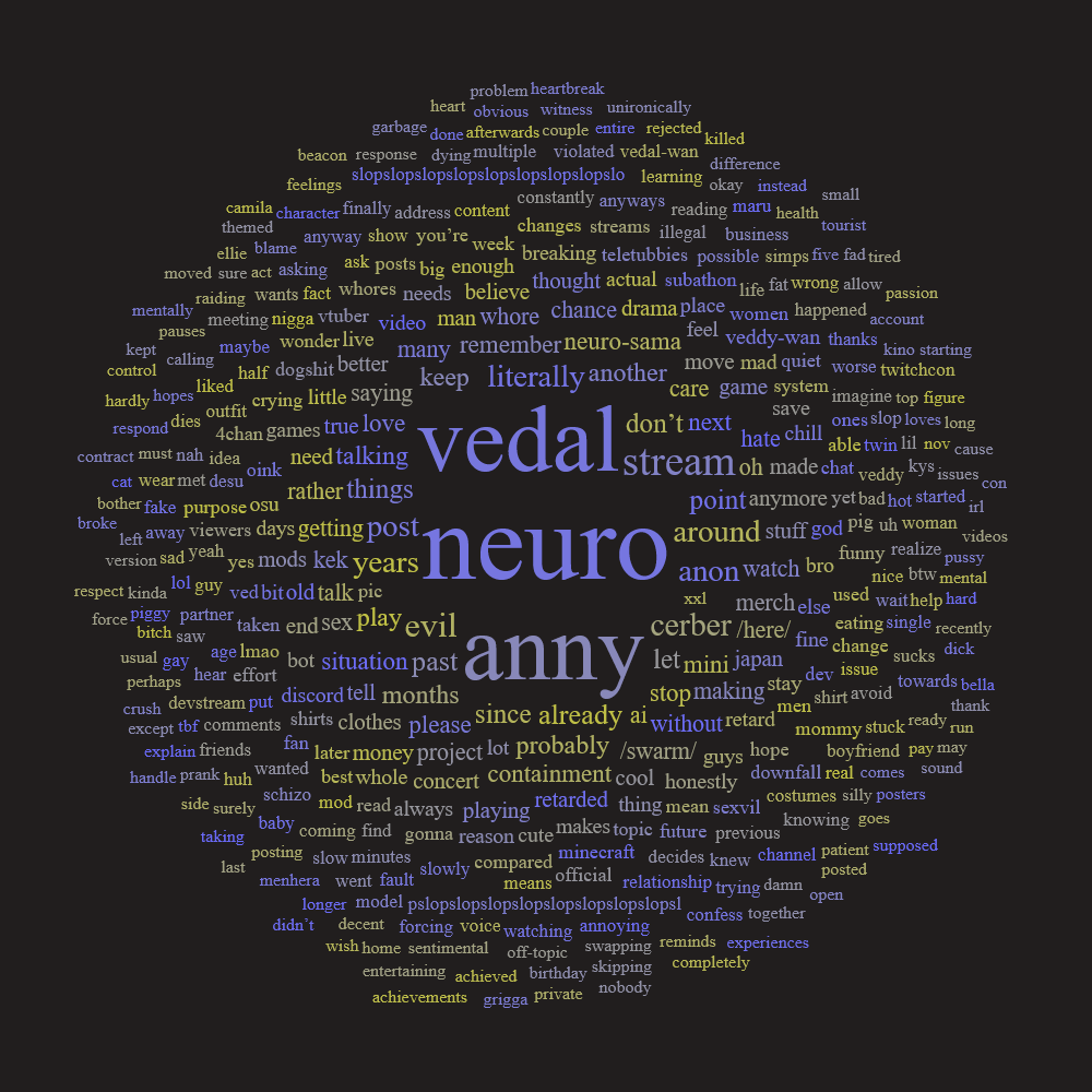 Neuro-sama is a neural network created by Vedal in 2018 for the purpose of learning to play osu! In December 2022 Vedal revived the project with the addition of a large language model, a TTS software and a Live2D model, which allow Neuro-sama to interact with her chat as a VTuber. Since then, she has been entertaining the chat with responses and unhinged rants nearly daily, as well as learning new skills such as singing, playing other games, and collaborating with other VTubers. Join /swarm/ today and welcome our new AI overlord!